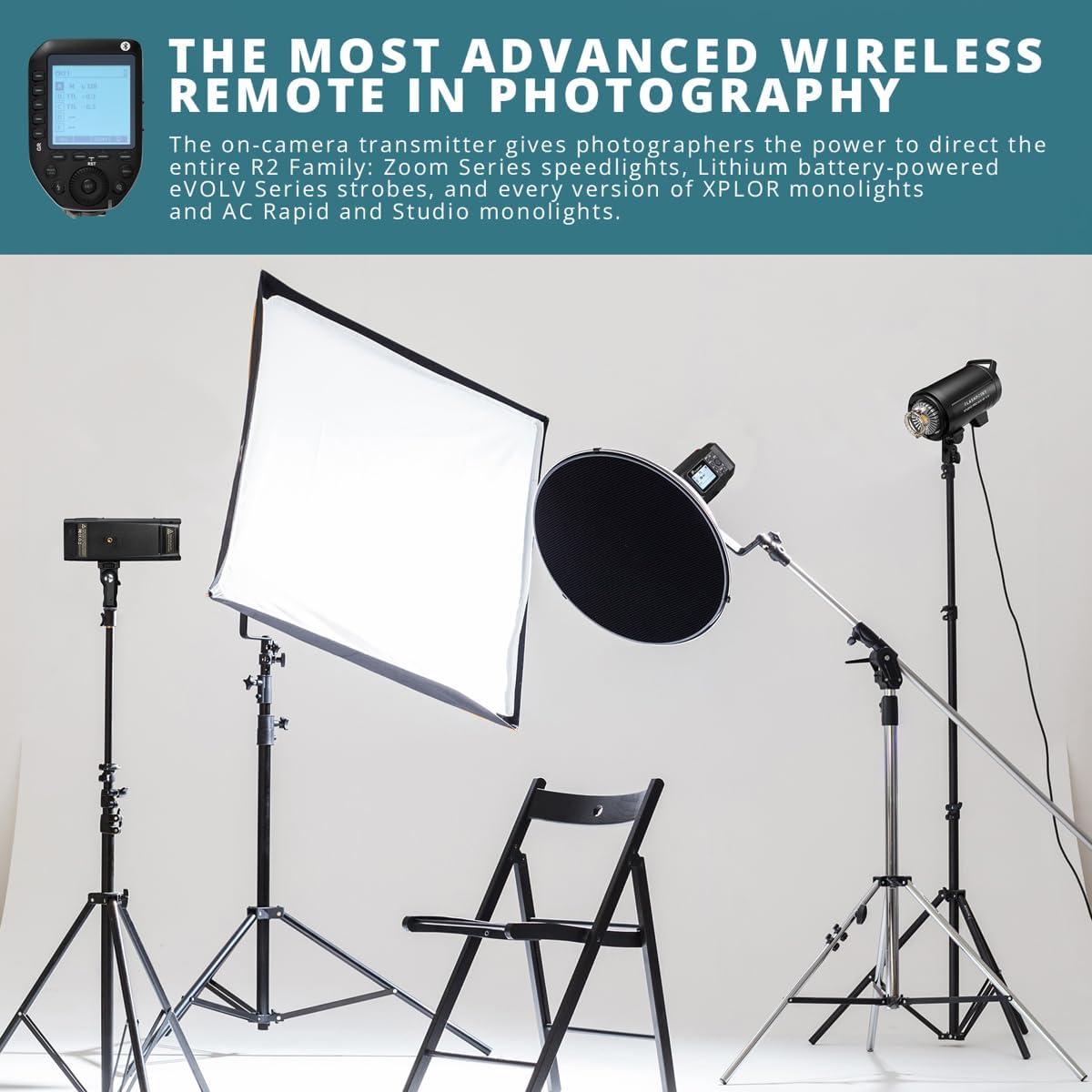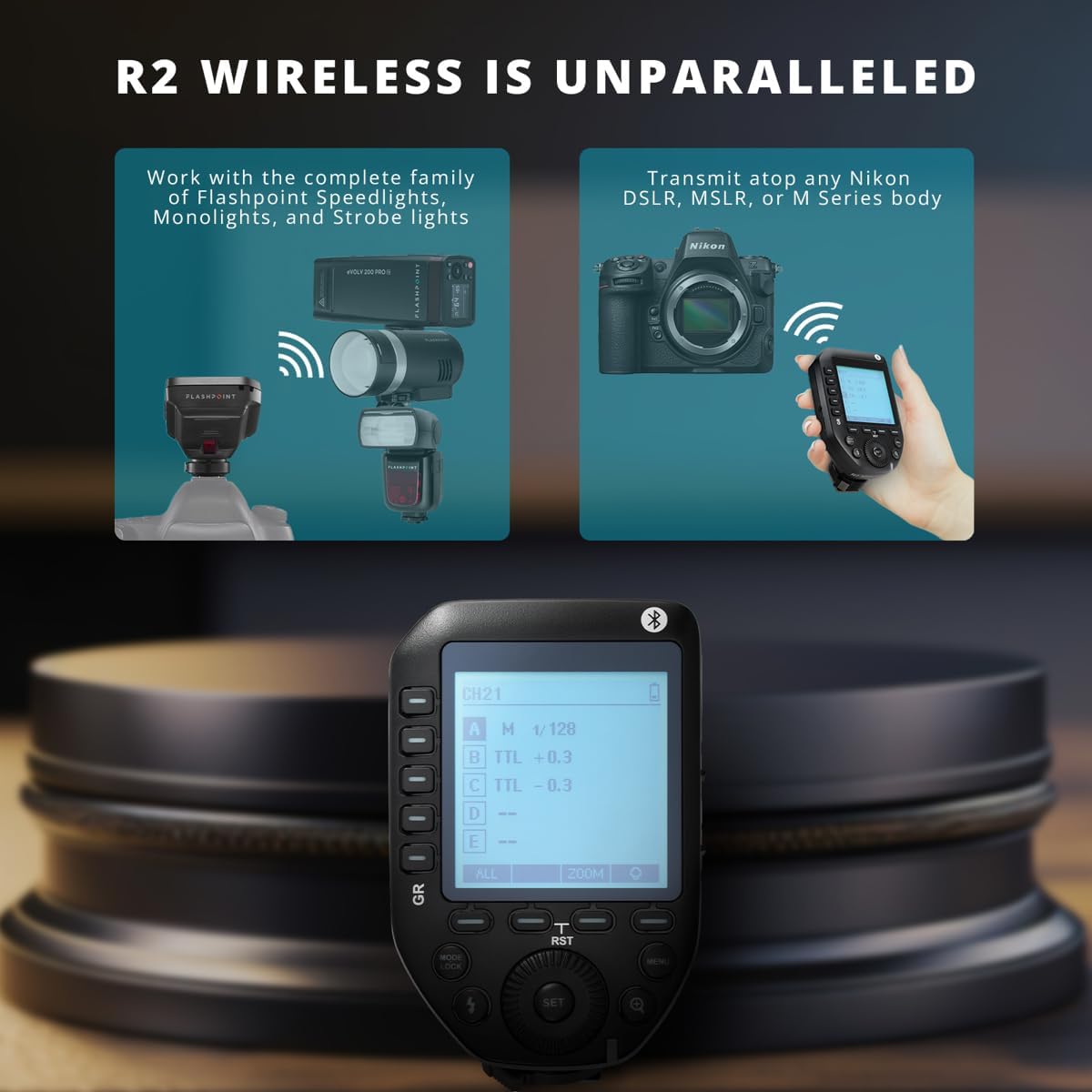 It's time to elevate your photography experience with the Flashpoint R2 ProII N, a superior wireless flash trigger exclusively designed for Nikon cameras. This advanced device serves as the ultimate command center for the R2 Family of Flash, offering unprecedented control over Flashpoint R2 wireless system devices. The ProII N is an enhanced version of the acclaimed FP R2 Pro, offering expanded precision for professional photographers. It seamlessly integrates with the Sekonic L-858 Light Meter via the optional RT-GX radio module, providing accurate and reliable light measurements for optimal shooting conditions. The R2 ProII N features intuitive Group buttons located on the left of the display panel for quick and easy access. It also boasts built-in Bluetooth connectivity, allowing you to link it to the graphical FP Smartphone APP. This innovative feature provides remote operation capabilities up to a range of 328 feet or 100 meters, making it an ideal companion for both Apple and Android mobile photographers. The R2 ProII N is not just about functionality, but also about customization. It offers multiple dual-purpose custom button assignments and single-pin non-automated triggering, allowing you to tailor your shooting experience to your specific needs. The device's 2 Way TCM - TTL to Manual settings and back again, ensures consistent exposure values for repeat capture accuracy. You can effortlessly flip between Manual and TTL modes, ensuring