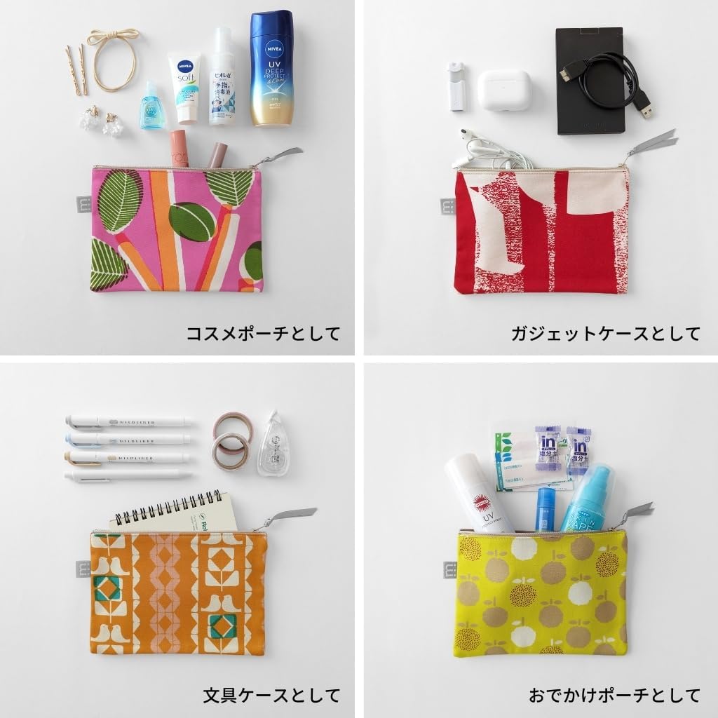 A pouch made of a shaggy fabric that was discarded. SDGs commitment with Mini Minimo and Kinko Co., Ltd. (cushion manufacturer) Minimai fabric is fun and Scandinavian The large pattern and brightly colored pouch will make your mind look very good. No gusset and flat design to keep your bag neat and organized. Not only is it a cosmetic pouch, but it is also recommended for storing small items such as stationery, gadgets, or as a disaster prevention pouch. Do you want to start with a design that feels Nordic and has a cloth design.