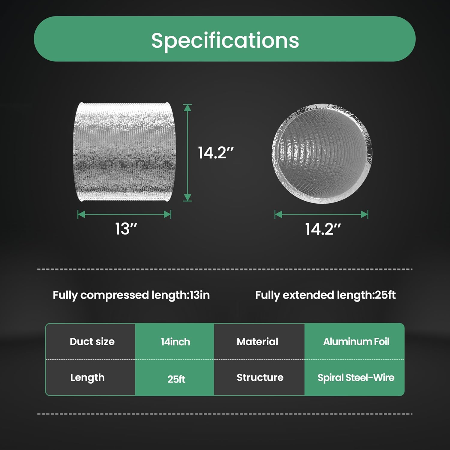 | Included Components | 1 X 14 Inch 25 Feet Aluminum Ducting; 2 X Clamps |