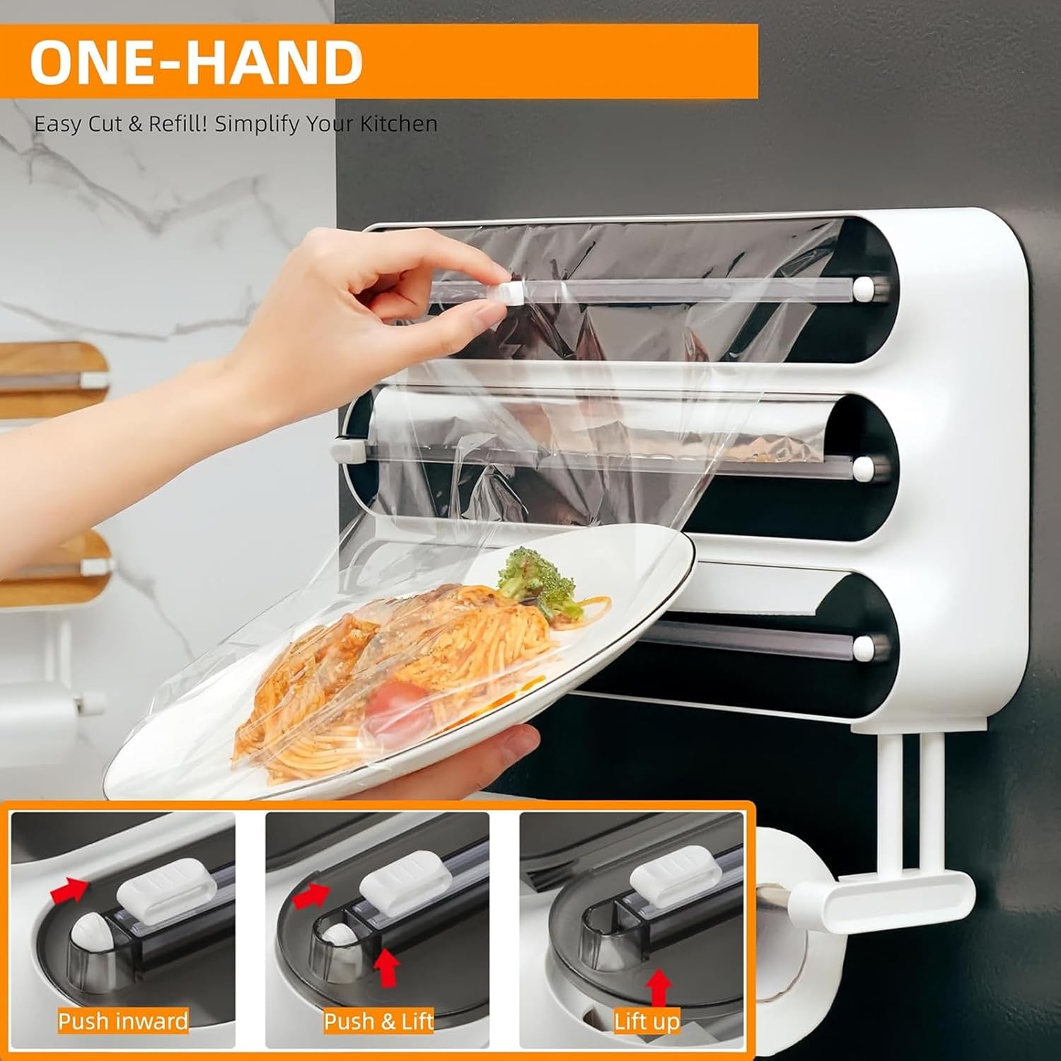 Flexible Kitchen Film Dispenser Having Sliding Parts And Hooks For Wall Or Countertop Placement Features: Versatile Wrap planner: This film holder with built in trimmer stores rolls of food wrap, foil or baking sheets along with kitchen towels in a compact unit The combined design simplifies setup while saving counter space for kitchen organization needs Secure Built In Trimming Feature: Includes two hidden sliding trimmers that provide accurate cutting without direct hand Creates straight edges to uneven tears and reduce extra usage of wraps and foils Flexible Installation Methods: Has strong bases for stable placement on refrigerators or metal surfaces Equipped with back hooks for wall or counter mounting adaptability in your cooking space Standard Roll Fit: Holds common wrap rolls up to 12 " wide ( 30.5cm) and 5.9 " diameter ( 15cm) Works with replacement rolls having 1.18 " ( 3cm) inner size and extended 492ft length for film keeping Sturdy polyethylene Build: Made from robust polyethylene substance that ' s safe for repeated use and deficits strong odors Provides consistent service as a kitchen wrap holder and dispenser unit Specifications: Substance: polyethylene Size: Suitable for standard size wrap Properties: design, easy to adsorb on refrigerator or metal face Technical parameters: Built-in cutting ensures neat and burr incisions every time Package Includes: Kitchen expendable cling film cutter × 1 Note: Pay attention to the storage methods