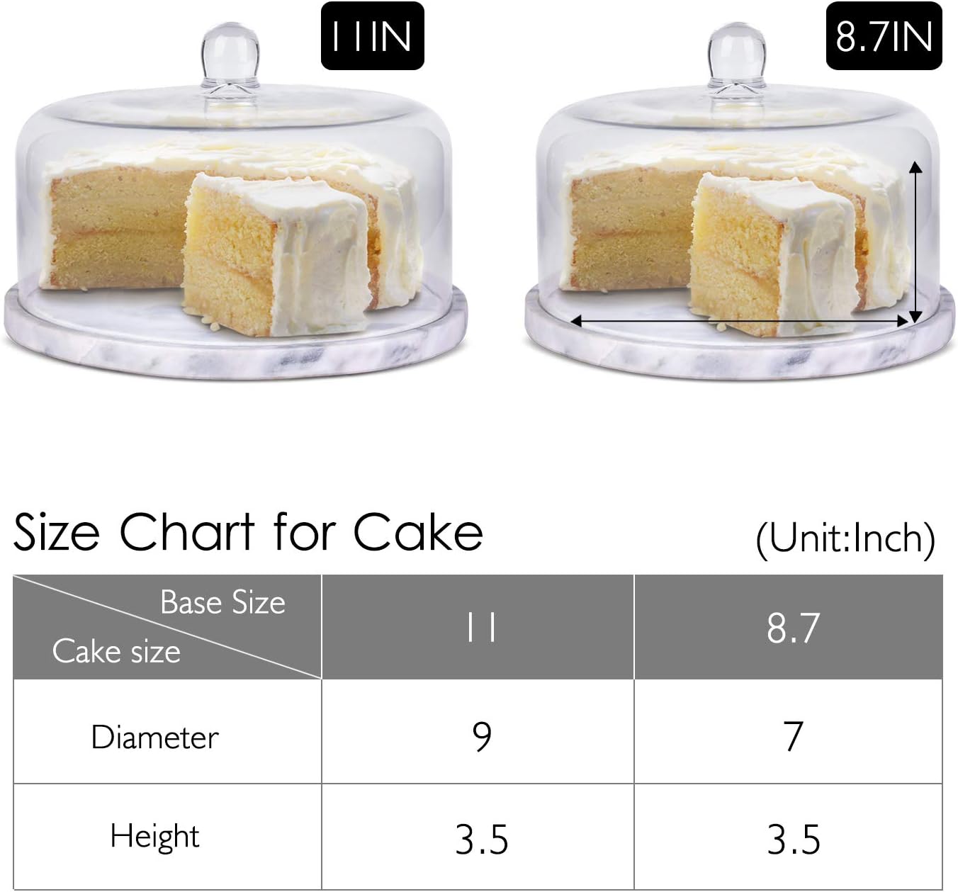 Cake stands can be very versatile! Don't just use them on special occasions and parties; they can be used to present and serve on family gatherings, weddings, baby showers, or to spice up your daily boring dinner time. As you can serve so many different things in just one, you won't have to stock your cabinets with many serving bowls and stands.This eye-catching marble cake stand gives your baking ensembles the respect and attention it deserves. It works great to present your baking creation as well as chips and dips, salads, veggies, and much more. Along with showcasing and serving the desserts and appetizers, it also preserves its freshness until it is served, great for buffet-style dinners and parties.Specification:Marble Base (L x W x H): 28*28*2 (cm)/11*11*0.8 (in)Glass Cake Cover (L x W x H): 24*24*10.5 (cm)/9.45*9.45*4.1 (in)Color: Grey & WhiteCake Stand Net Weight: 4.3 Kg/9.5 lbsNote: Marble should not be immersed in water. Instead, they should be wiped clean with a damp cloth and using a neutral cleanerExposure to acidic substances like vinegar, citrus fruit, wine, coffee, tea, tomatoes, and mustard, should also be avoided as these could easily stain the marble materialDue to natural variations in the marble, color may differ slightly from the imagesPackage Content:1 x Marble Cake Stand Base w/ Roomy Glass Cover Dome, Multifunctional Serving Platter, Cutting Board Slab - Heavy Weight Cheese Dish Holder Set for Baker Baking Bakery Chef Donut Cookie Pastry Fondant Pie, 11 In