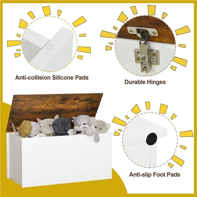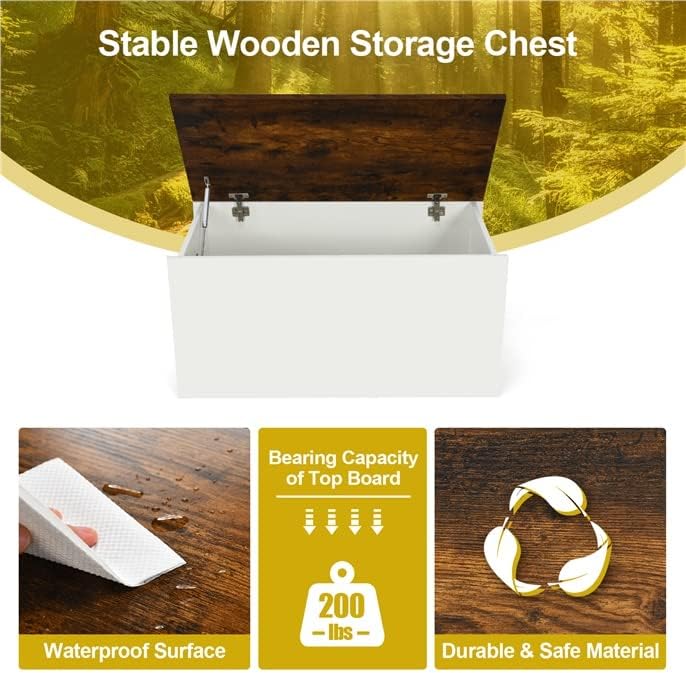 Description:Made from high quality engineered panels and durable hinges, the wooden storage unit has thick panels and plenty of storage space. It allows for efficient storage of miscellaneous items such as clothes, toys, shoes and sports equipment, keeping the space clean and tidy. Fitted with safety hinges and pneumatic levers, it is self-securing at certain angles, freeing up your hands. It can be placed in living room entrances, bedrooms, children's playrooms, balconies, garages, etc.Features:Made from high quality engineered panels for overall robustness and durabilityProvides ample storage space, keeping the space clean and tidyFeatures a top cover design that opens and closes easilyImpact resistant pads to keep fingers safe and silentTable top is strong enough to support up to 200lbsCan be placed in toy rooms, bedrooms, living room entryways, garages and other environmentsEasy to assemble, time-saving and easy to cleanSpecifications:Color: Rustic Brown + WhiteMaterial: Particle Board + PVCOverall Size: 35.5” x 17.5” x 18”(L x W x H)Internal Size: 32” x 15.5” x 16.5” (L x W x H)Net Weight: 45 lbsLoad Capacity of Top Board: 200 lbsPackage Includes:1 x Storage Chest1 x User’s Manual