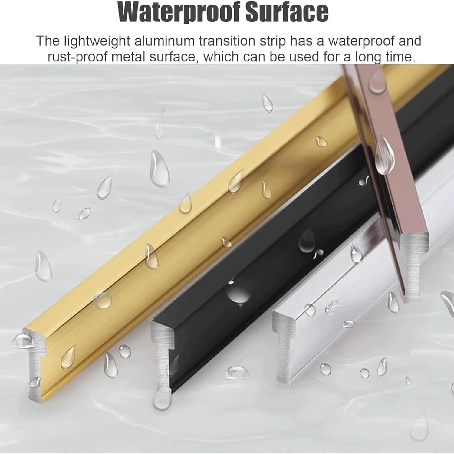 Our threshold/floor transition strips offer the following advantages:They are durable, waterproof, pressure-resistant, easy to clean, anti-oxidation, fade-resistant, and wear-resistant.They balance safety and comfort, feel soft and comfortable underfoot, and provide a smooth transition between adjacent floors of similar heights.They are resistant to aging, flame retardant, stains, and environmentally friendly, withstanding long-term wear and tear even in crowded areas.Product Name: Floor Transition Strip/Threshold Strip/Floor Transition/Transition Strips/Threshold Transition Strip/Floor Gap Strips/Flat Divider Strip/Threshold Edging Trim Strip/Floor Cover Strips/Doorway Trim/Doorway Edge Trim/Door Thresholds/Door Threshold StripMaterial: Aluminum AlloyColors: Black, Gold, SilverLengths: 90cm, 100cm, 110cm, 120cm, 130cm, 140cm, 150cmWidth: 5mm/0.19inIncluded:1 x Transition StripWarm Notice:1. This product does not include items other than those shown in the product image.2. Please allow 2-3% discrepancy due to manual measurement.3. Due to lighting and shooting angle, there may be slight discrepancies and color differences. Thank you.