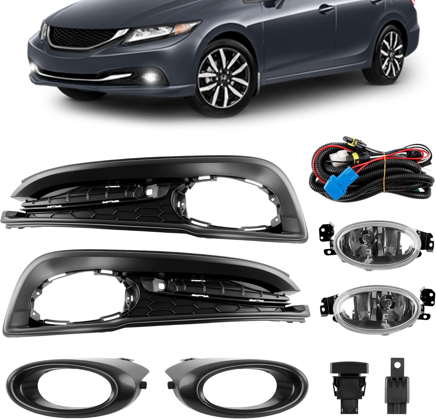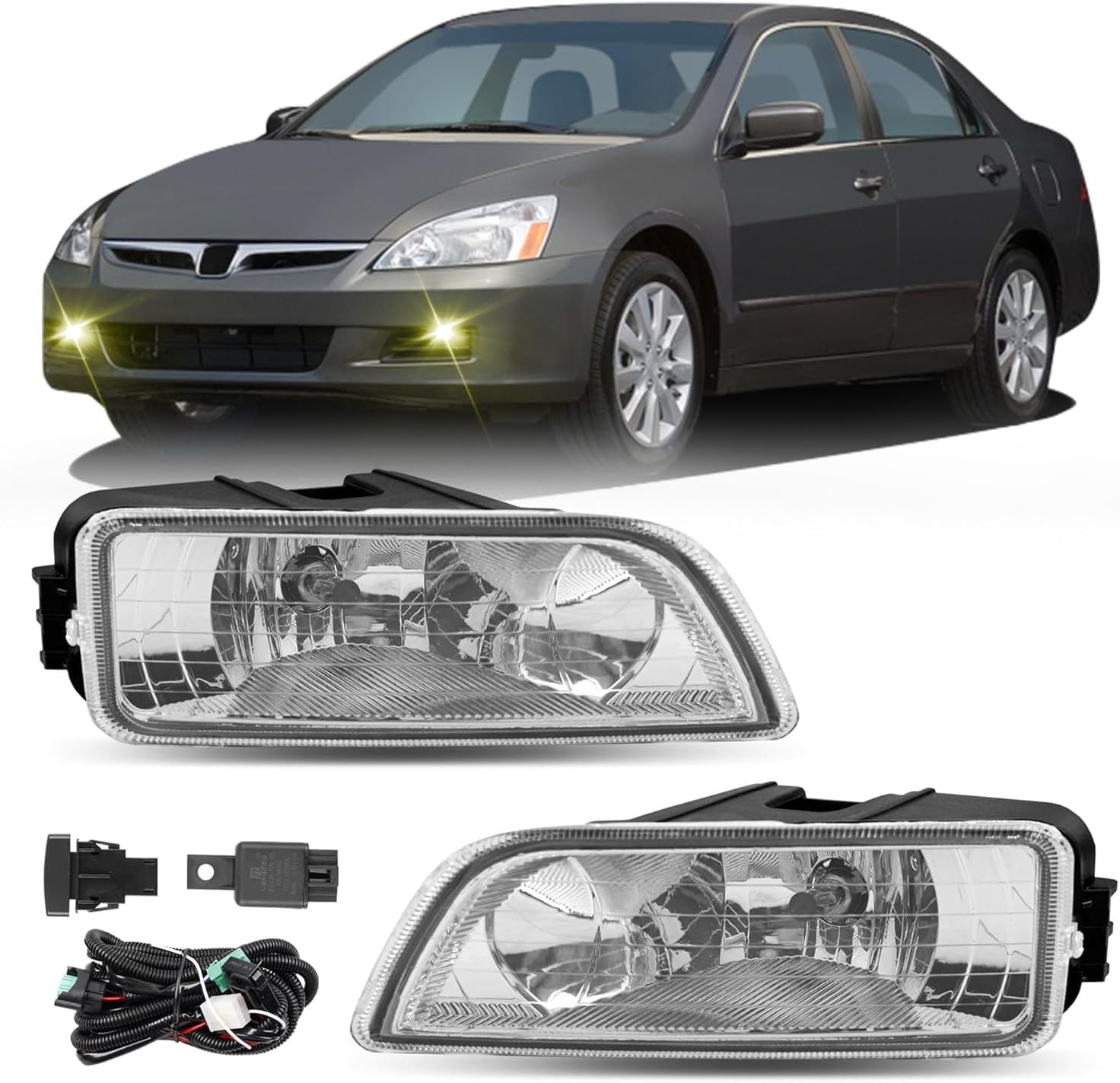 Front Bumper Fog Light Assembly Kit Compatibility Compatible with 2019 GMC Sierra 1500 Compatible with 2020 GMC Sierra 1500 Compatible with 2021 GMC Sierra 1500 Compatible with 2022 GMC Sierra 1500 OE Replacement Part Numbers 23243505 23243506 23243489 23243488 Fog Lamp Replacement Kit Specifications Type: Front Fog Lamp Material: ABS Plastic Wiring Harness: Included Lens Color: Clear Package Include: 1 Pair of Fog Lights (Driver and Passenger Side) Fog Light Kit Package Include 2x fog lamps(driver and passenger sides) 1x wiring kit 1x Switch