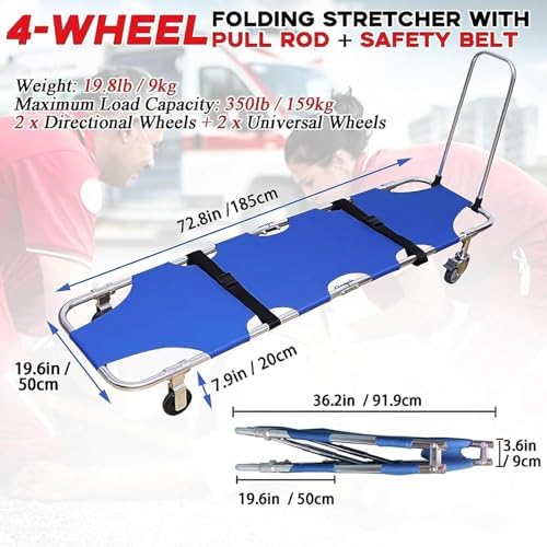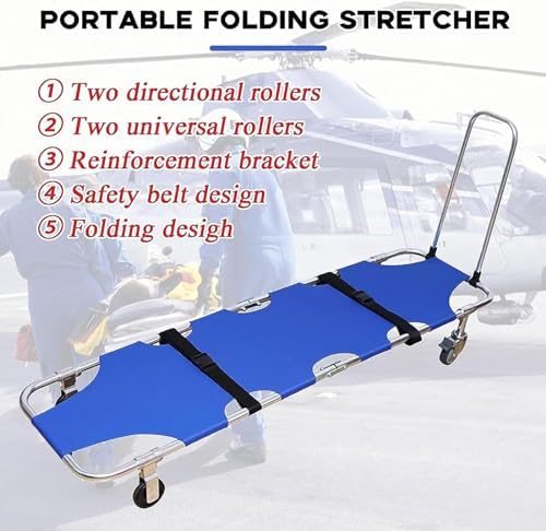 This stretcher is designed with an aluminum tie bar and features two directional wheels alongside two universal wheels equipped with brakes, facilitating easy maneuvering and reducing effort during transport. Constructed from industrial-strength materials, it merges high-strength aluminum alloy with 600D oxford fabric, offering waterproof durability and ease of cleaning. A safety belt is included to ensure the secure transport of patients. Its reinforced folding link design allows for convenient storage and transportation, making it easy to fit into the trunk of a car. Suitable for various scenarios, including ambulance rescue, hospital use, and fire rescue operations. **Specifications:** - Style: Folding - Color: Blue - Material: Aluminum alloy and oxford cloth - Unfolded Size: 72.8*19.6*7.9 in / 185*50*20 cm - Folded Size: 36.2*19.6*3.6 in / 91.9*50*9 cm - Package Size: 38.6*8.7*21.2 in / 98*22*54 cm - Weight: 18 lb / 8 kg - Weight Capacity: 350 lb / 159 kg **Packing List:** - 1 Foldable Stretcher