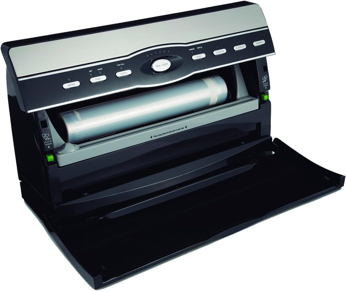 The FoodSaver V3880 fully automatic vacuum sealing kit is full of features and benefits you’re going to love. Its stainless steel finish, user-friendly controls with seal button in the middle, and fully automatic operation make this new unit a must have for the kitchen. The FoodSaver V3880 is hands-free, safely packages moist, dry and delicate food and has a built-in retractable accessory hose, roll holder, cutter and bag opener. Liquid detection prevents spills and a marinate mode infuses food with flavor in minutes. Keep all your food fresh with FoodSaver bags, FoodSaver containers and FoodSaver accessories. The Starter Kit includes: 1 - 11" x 18' FoodSaver Roll, 12 - Quart Size FoodSaver Bags.