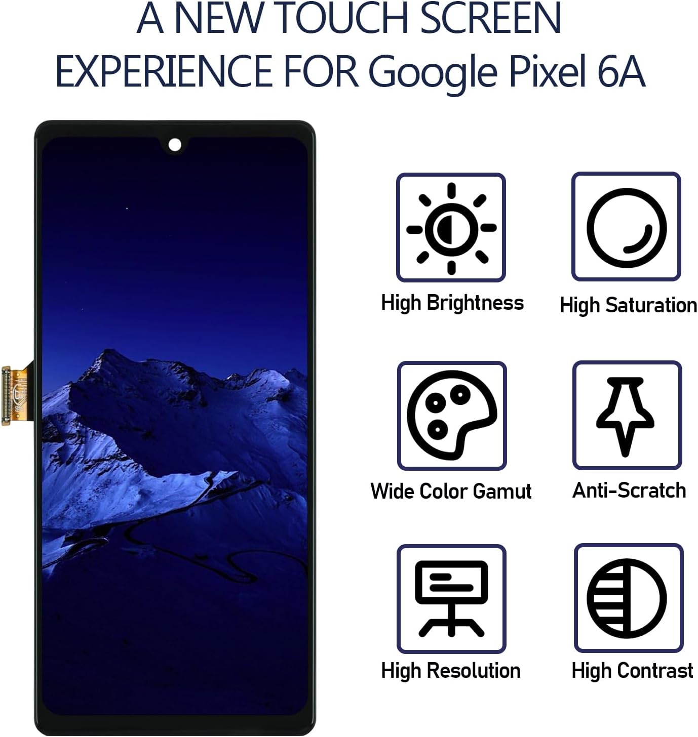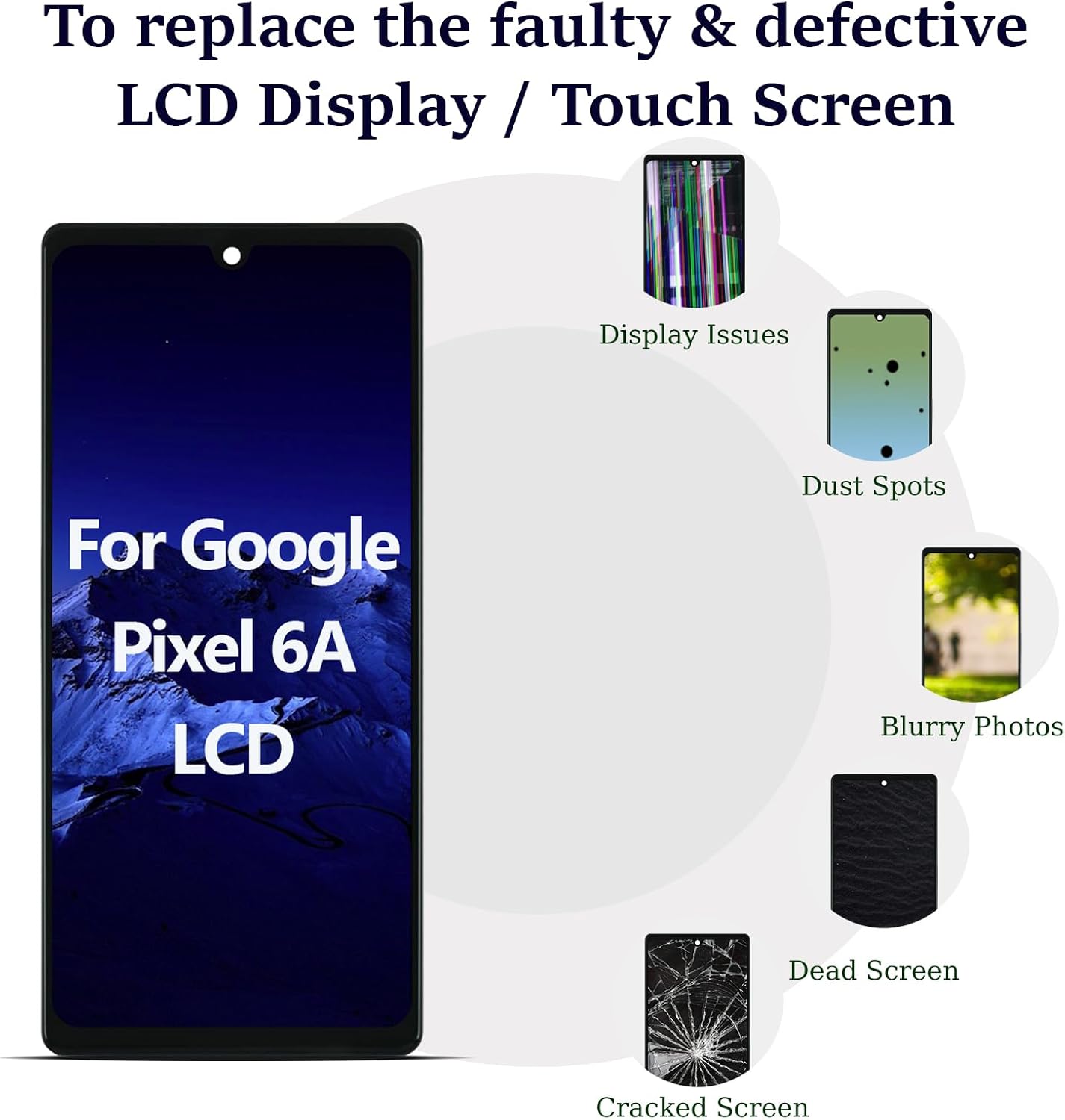 This screen replacement fits for Google Pixel 6A models GX7AS, GB62Z, G1AZG, GB17L—confirm your screen model first. Before replacement, turn off your phone; a hair dryer to soften glue eases screen removal. It fixes cracked glass, display/touch issues, or abnormal colors, restoring full functionality for daily use. Each unit passes pre-shipment checks (dark spots, light leakage, touch sensitivity) and is easy to install via YouTube instructional videos.