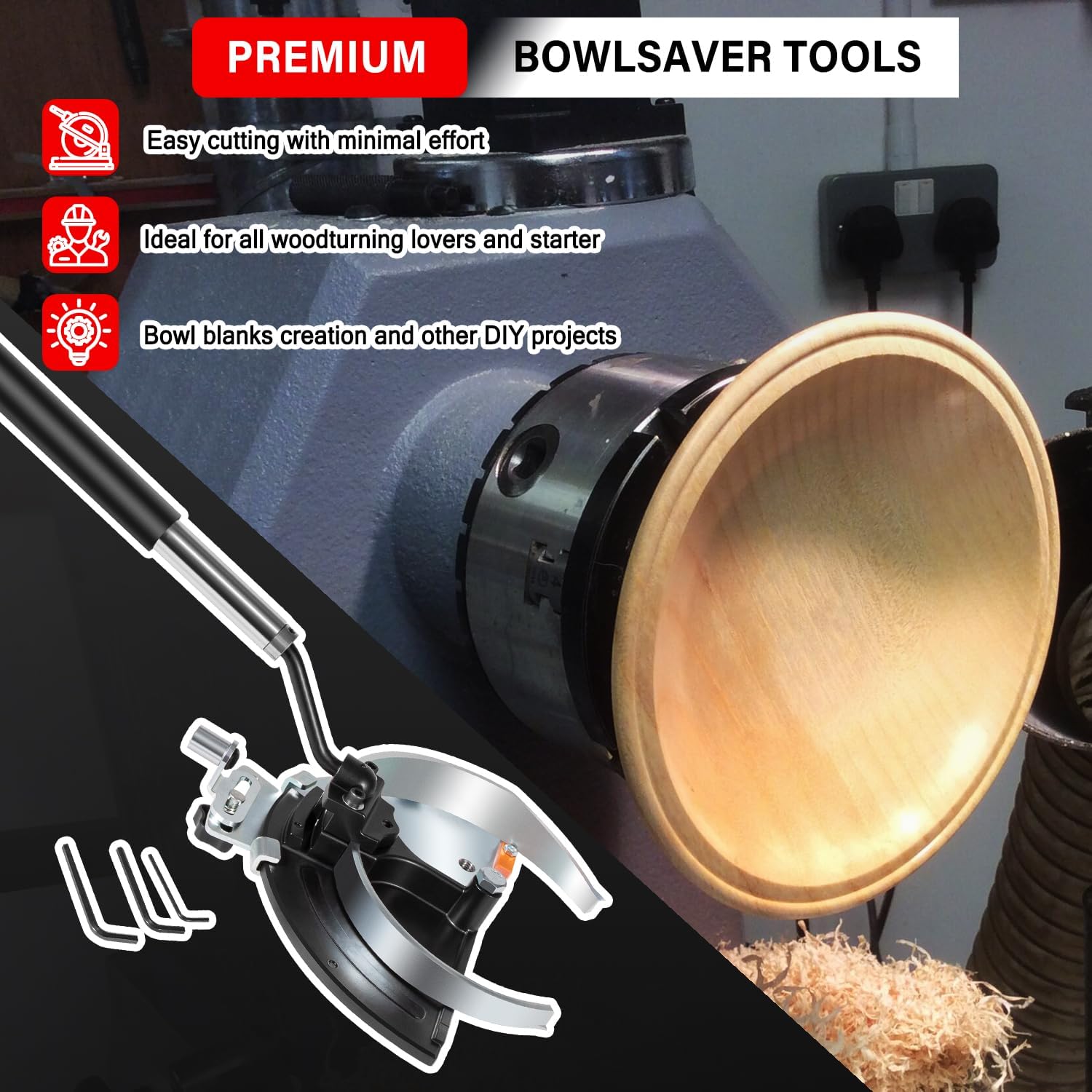 Features:1. Practical Use: Ideal for either professional or amateur woodturning lovers and starter to do their bowl blanks creation and other DIY projects. It is designed to remove bowls from 3" to 12" up to 5" deep from the inside of the mother bowl.2. Premium Material: The coring device is attached with the tool rest tail stock to prevent any potential injury, which is the safest choice on the market. The Stellite cutters equipped on the bowlsaver can cut both green or seasoned wood easily and smoothly.3. Easy Operation: You can use this kit to create multiple bowl blanks and vessels in different shape easily.If your item is defective, incorrect, arrived damaged or any other problems, please send us emails. Describe the nature of the problem (please include pictures if possible). You will be taken care of as quickly as possible.