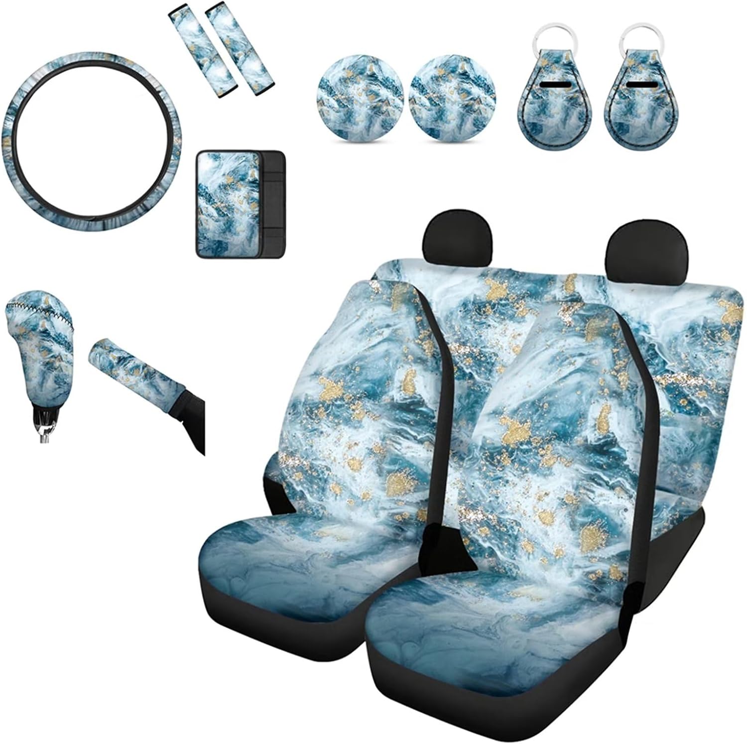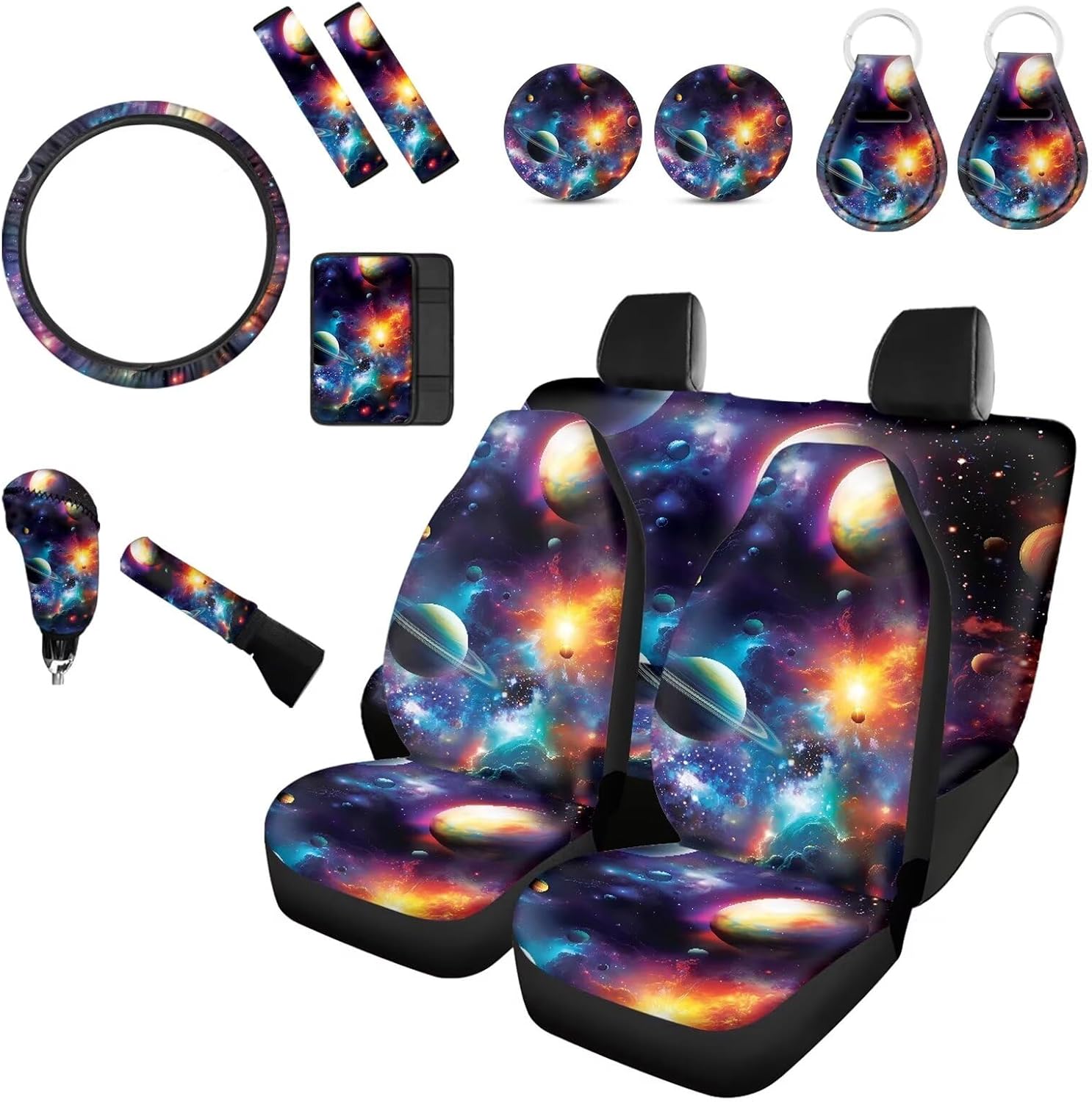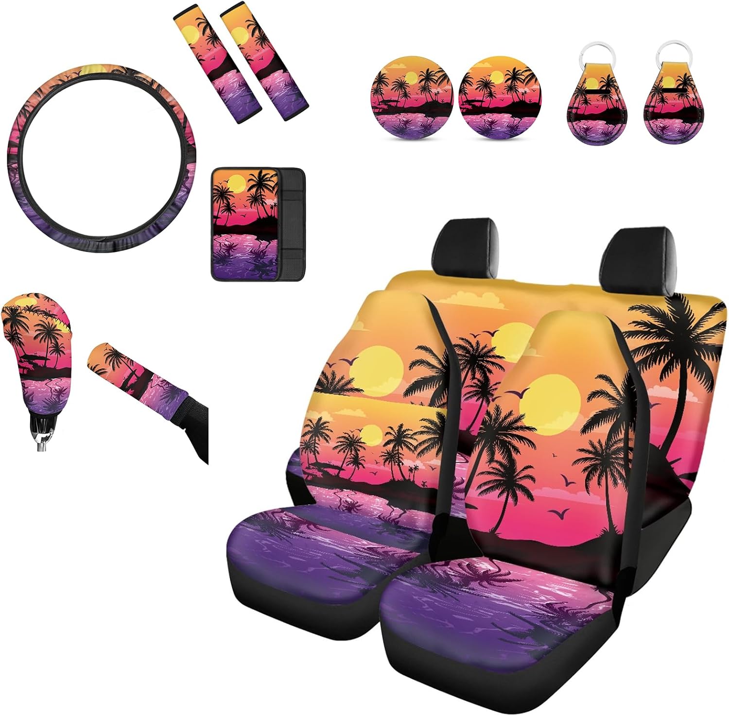 [14 pieces car interior accessories] 4 Seat Cover for Front Rear,2 Seat Belt Cover,1 Steering Wheel Cover,1 Armrest Cushion,1 Handbrake Cover,1Gear Shift Cover,2Car Coaster,2 keychain. [Notes] These car seat cover are not compatible with seats that have integrated airbags. East to install and care,could install with no tool need.washable! If you are not sure car seat covers is suitable for your car seat,please measure your seat size before order to ensure it is fit. Universal fit for most cars suvs trucks vans