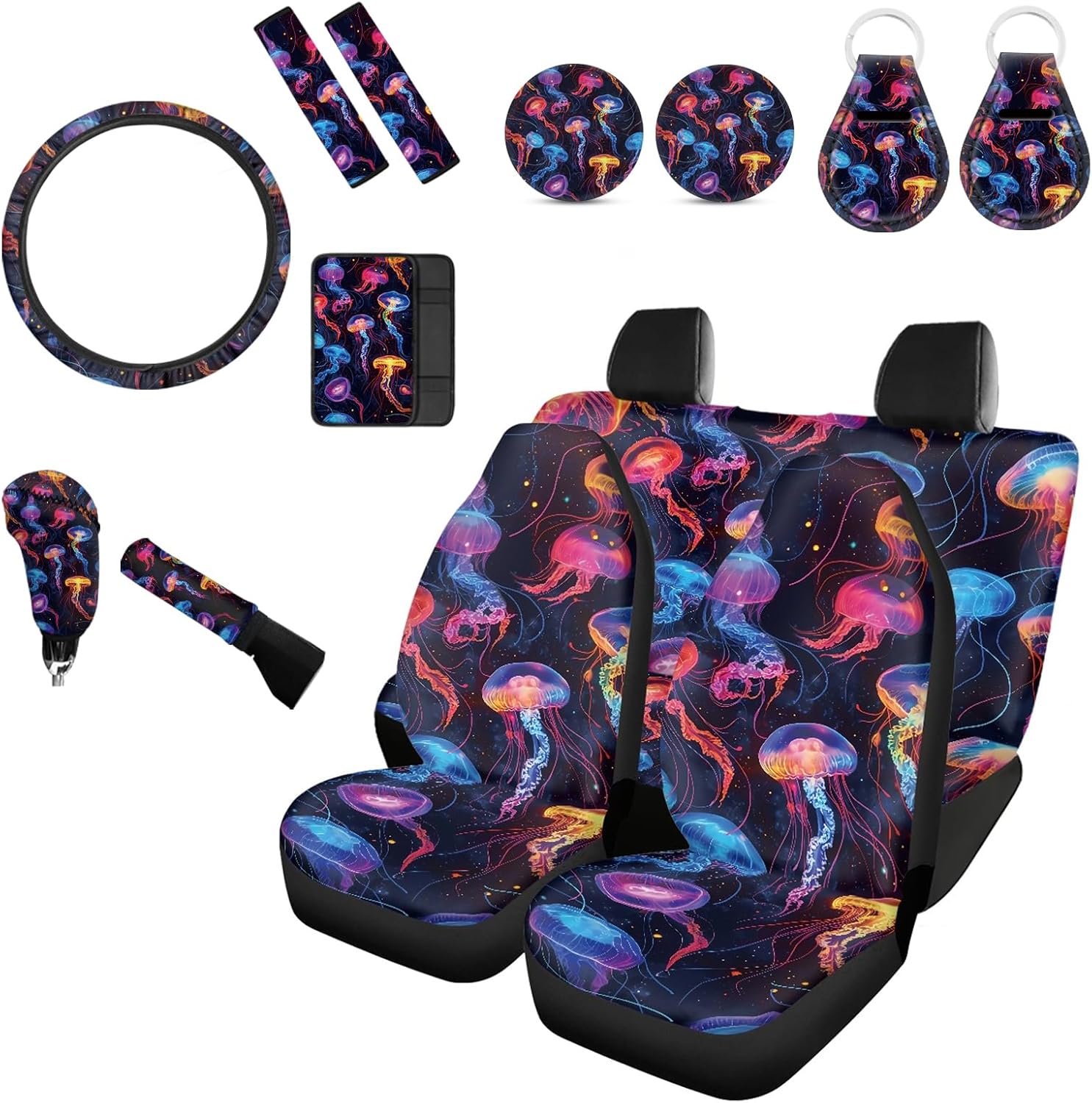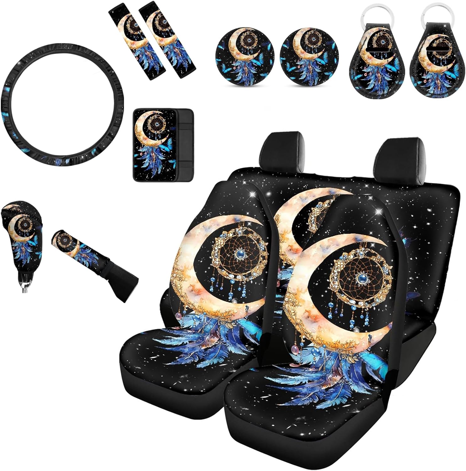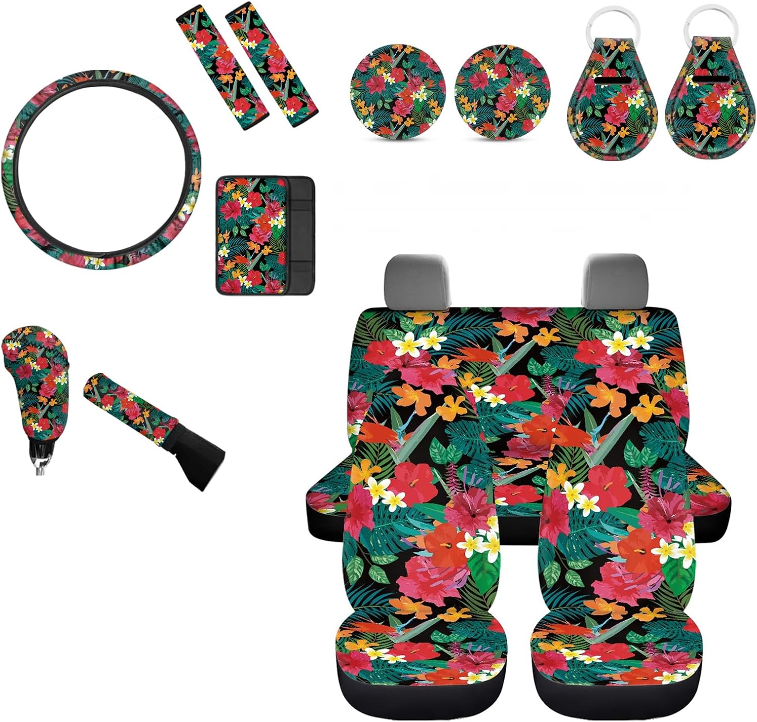 [14 pieces car interior accessories] 4 Seat Cover for Front Rear,2 Seat Belt Cover,1 Steering Wheel Cover,1 Armrest Cushion,1 Handbrake Cover,1Gear Shift Cover,2Car Coaster,2 keychain. [Notes] These car seat cover are not compatible with seats that have integrated airbags. East to install and care,could install with no tool need.washable! If you are not sure car seat covers is suitable for your car seat,please measure your seat size before order to ensure it is fit. Universal fit for most cars suvs trucks vans