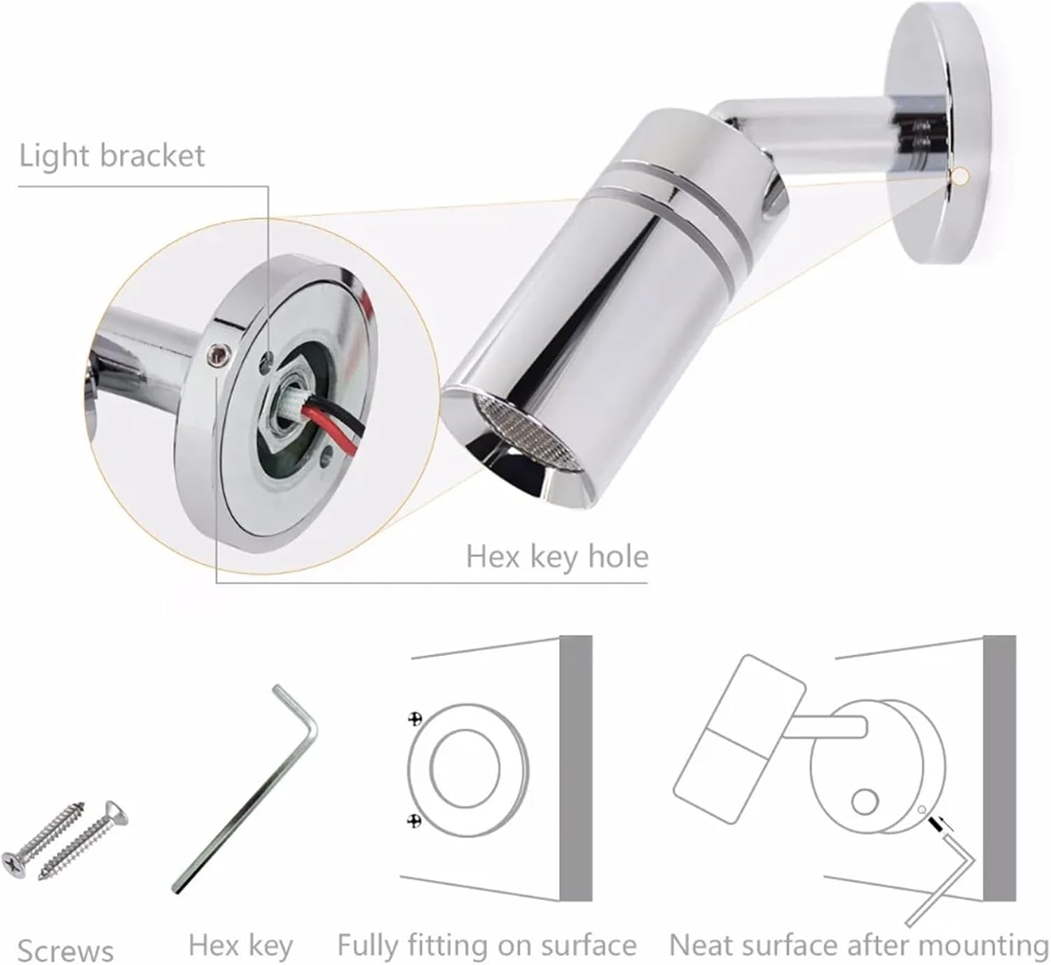 Product Nane: Reading Light Product Voltage: 12/24V Product Power:3W Color: Sliver Material: Aluminum Current Rating:0.7A Irradiation Area:1-3㎡ Package list:2* RV reading light Wiring Instructions: It can be installed horizontally or vertically. "+" connects to the positive pole, and "-" connects to the negative pole. Note: Please allow slightly 0-1cm difference due to manual measurement. Colors can appear different depending on light.