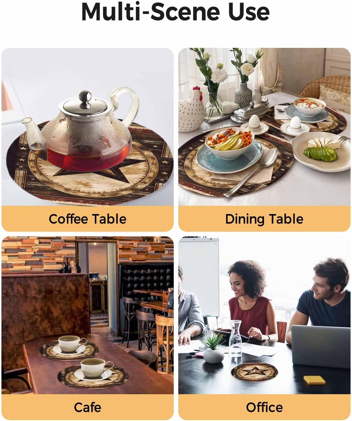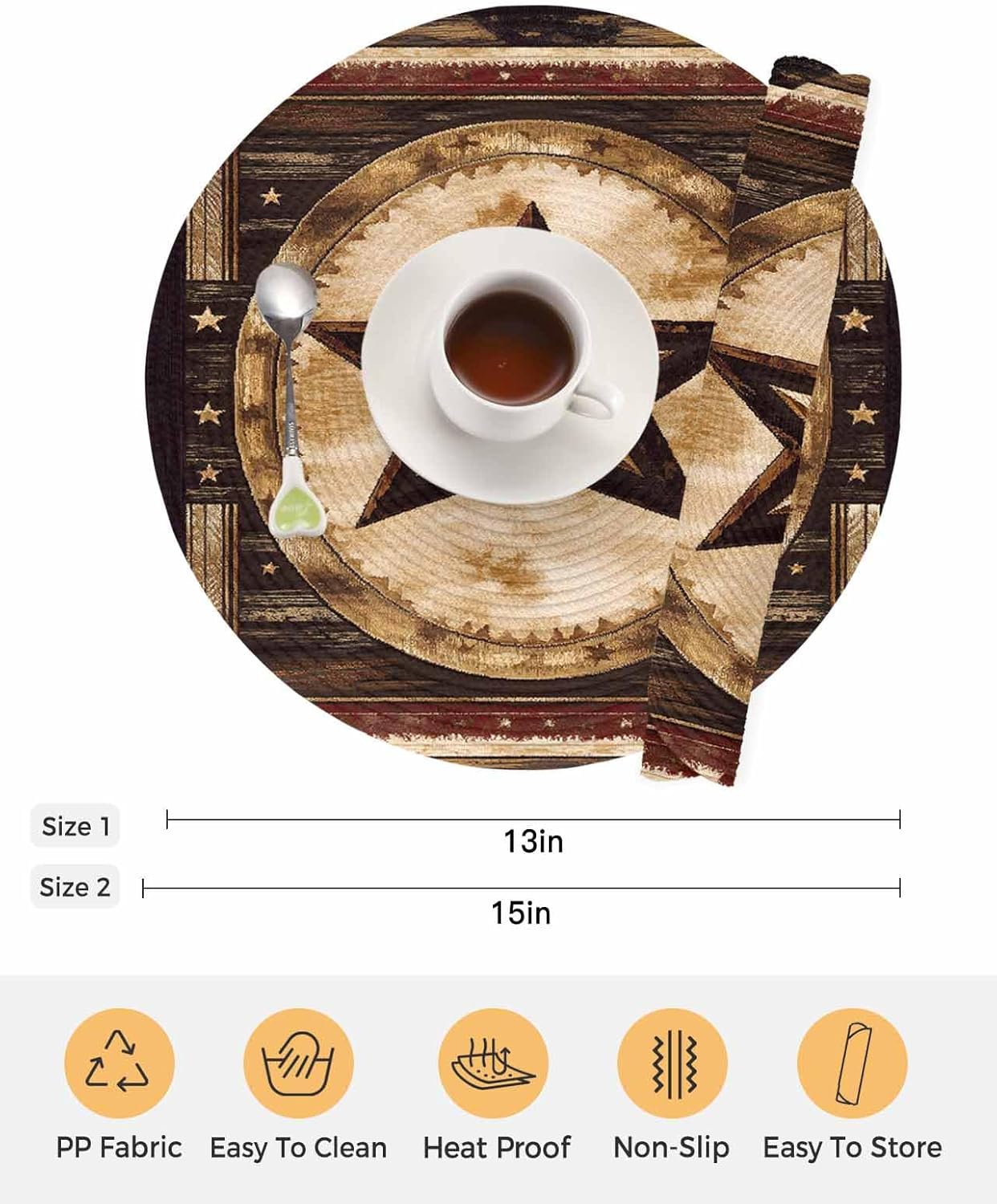 Material: Made by 100% high quality polyester material. Diameter 13" or ”15", proper size for a plate or a bowl. .Usage: These heat and stain placemats are also non-slip and anti-wrinkle, help protect your table. Using these placemats to decorate your dinning table and add more joy to your life.Easy Care: Washable. Easy clean , wipe clean with a damp cloth. Hand wash in cold water and air dry.Package: 2pcs placemats are rolled up in one paper box, they can be flat after being pressed for some time. Consider carefully before ordering if you mind this packing.Occasions: Use round placemats for kitchen, restaurants, hotel, or business office, Christmas, birthdays, Thanksgiving family gatherings, housewarming, holiday, parties, home, weddings and more. Perfect for daily use indoor or outdoor.DecorativeCan be placed under plates, cups,tableware,vases and ashtrays, as decorations to your dining tables and tea tables.Suitable for home, wedding, party, restaurant, hotel and bar, store.