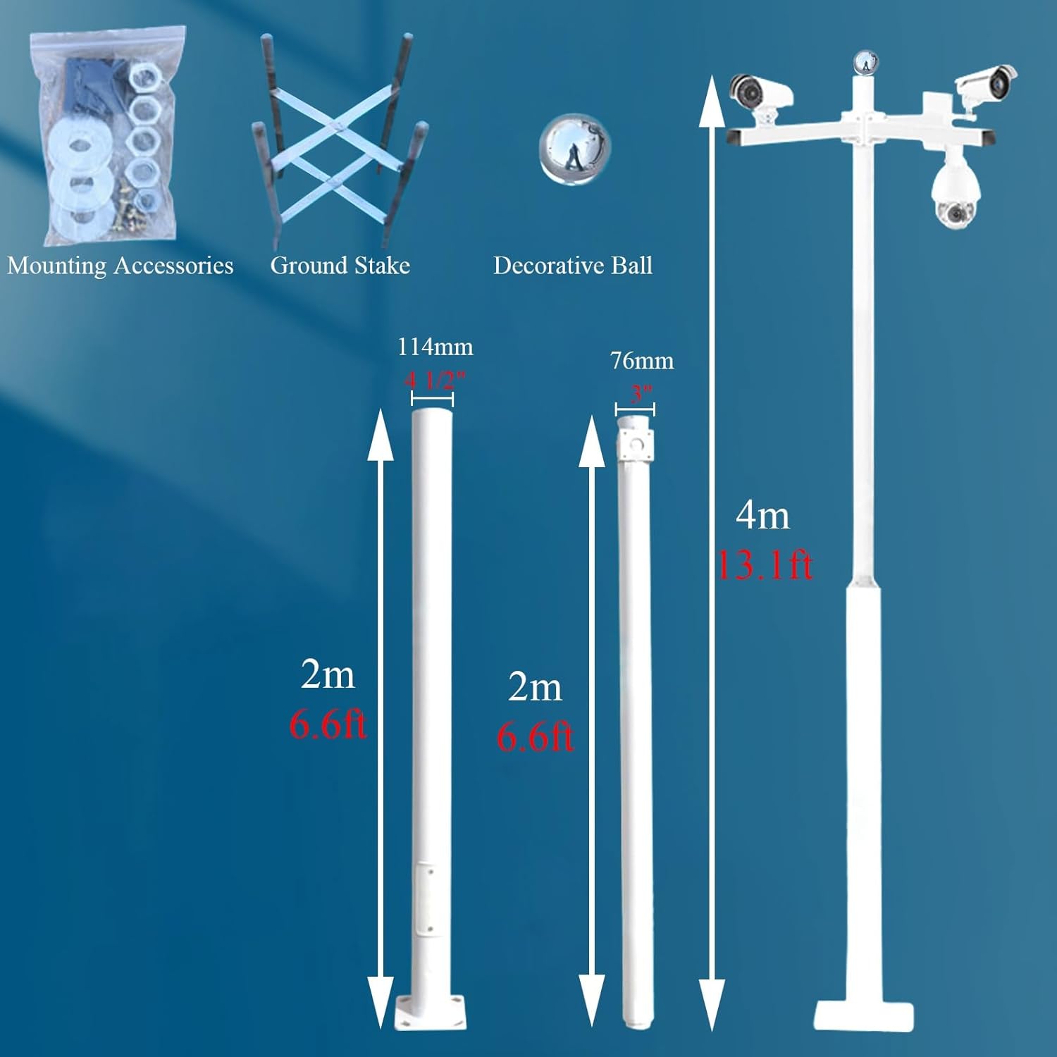- Strong, Weather-Resistant, and Ready to Secure Any Camera, Anywhere!Specification :- Material: Galvanized Steel- Color: White- Height: 2.5m (8.2ft) , 3m (9.8ft) , 3.5m (11.5ft) , 4m (13.1ft) , 4.5m (14.8ft) , 5m (16.4ft) , 5.5m (18ft) , 6m (19.7ft) Feature:- Made of high quality materials for long term use. - Four-way top plate supports multiple camera mounts.- Suitable for many different types of security cameras.- Available in multiple heights for different needs.- Detachable, segmented design for easy transport and setup.- Complete accessories included for quick one-person installation.- Perfect for homes, businesses, warehouses, roads, and parking lots.Package Contents:- 1 x Security Camera Pole- 4 x Security Camera Bracket- 1 x Ground Stake- All Mounting AccessoriesNotes:- Manual measurement, please allow slight errors on size. - The color may exist a slight difference due to different screen displays.