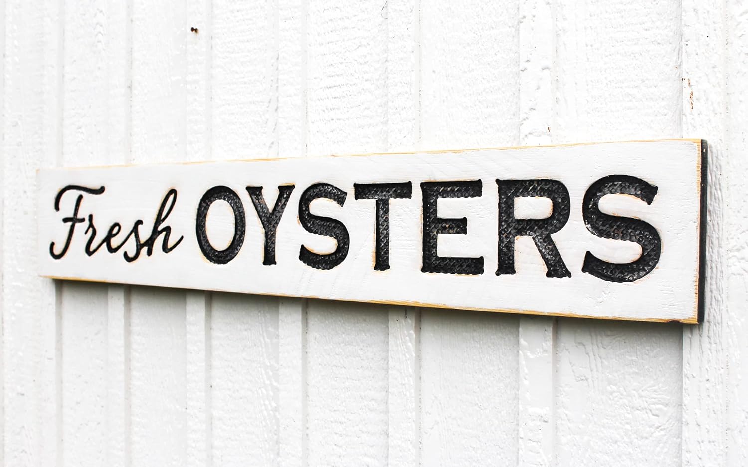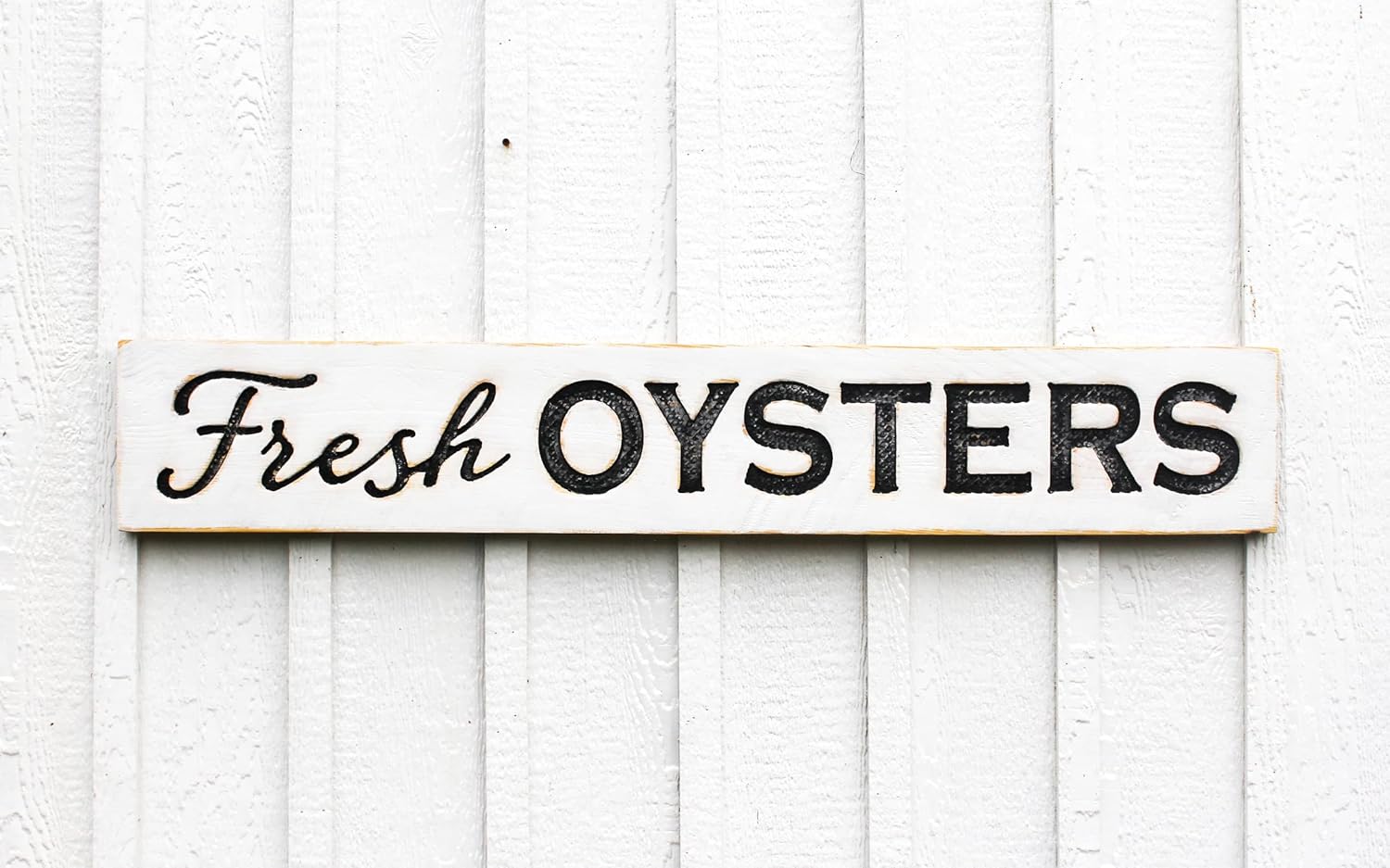 Elevate your coastal decor with the magnificent "Fresh Oysters" sign by Americana Signs. Measuring an impressive 48 inches wide by 8 inches tall, this horizontal sign is crafted with carved lettering. Whether you're decorating your beach house, seafood market, or any coastal-themed space, this sign adds a touch of authenticity and coastal charm that only handcrafted decor can provide. Display it proudly and let it tell the story of your love for life near the ocean. Wired and ready to hang. Interested in having a custom sign made in a similar style, send us a message.