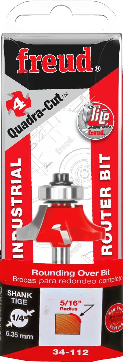 Product Description 5/16" Radius Rounding Over Bit (Quadra-Cut) From the Manufacturer Freud's precision ground carbide bits have a grain size smaller than other grades, and titanium is added making them impervious to chemical attack. Promoting safer woodworking is the reason Freud made a commitment to develop anti-kickback router bits. Bits are computer balanced to insure vibration-free operation at speeds that are a safe margin above the typical 22,000 RPMs of most routers. Freud's philosophy is woodworkers should expect safety, not pay for it. Over all diameter 1-1/8, large radius 5/16-inch, shank diameter 1/4-inch.