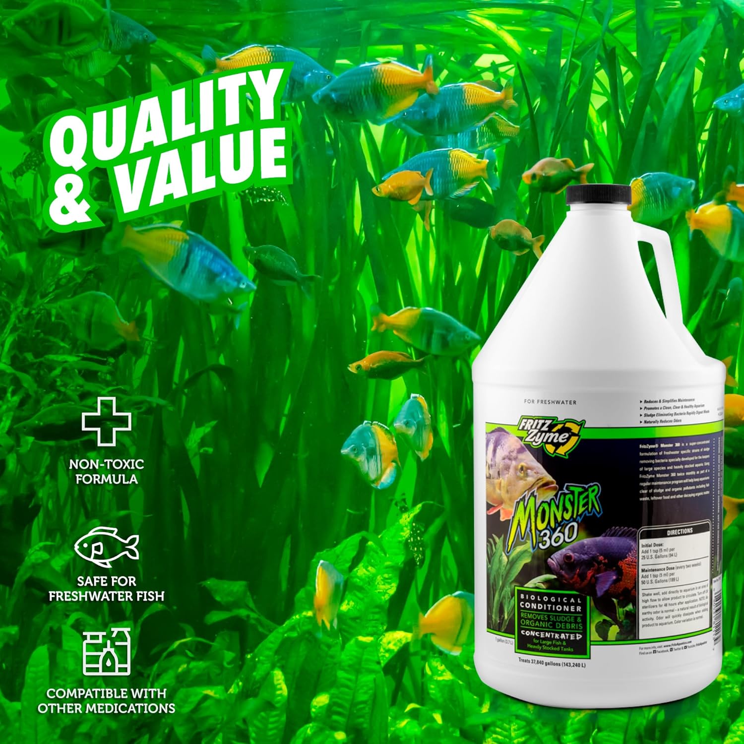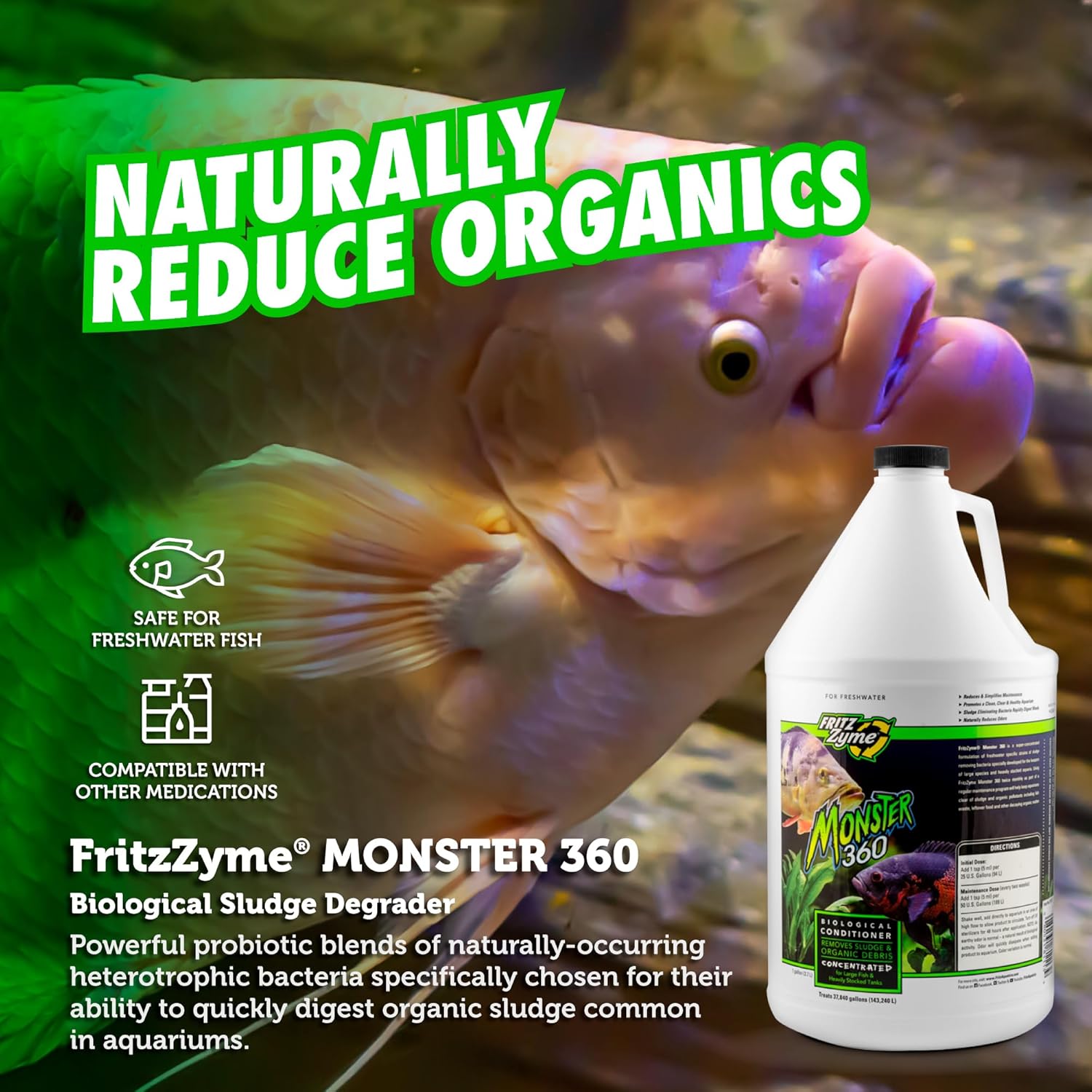 Powerful probiotic blends of naturally-occurring heterotrophic bacteria specifically chosen for their ability to quickly digest organic sludge common in aquariums. Sludge includes fish waste, leftover food and other decaying organic matter. When left unchecked, sludge can lead to unsightly algae growth. Rather than relying on freshwater bacteria to treat both fresh and saltwater, Fritz Industries has identified the species that naturally occur and perform best for each environment. FritzZyme Monster 360 contains only species of bacteria native to freshwater. The bacteria in FritzZyme Monster 360 is safe, non-toxic and non-pathogenic.