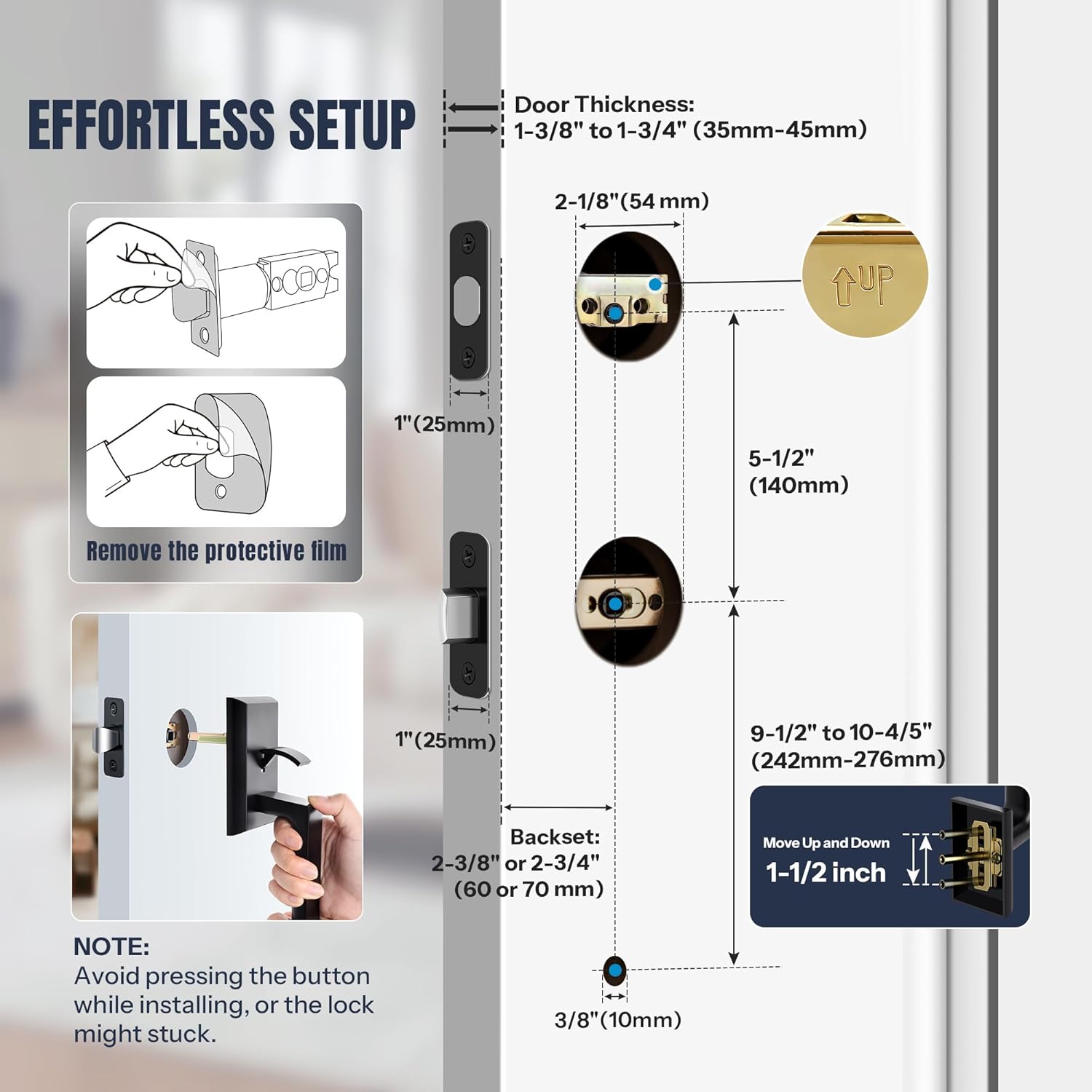 • 【Flexible Application】The universal latch requires no tools for easy insertion, suitable for standard doors with 2-3/8" or 2-3/4" (60 or 70mm) backsets, and fits door with a thickness from 1-3/8"-1-3/4" (35-45mm).