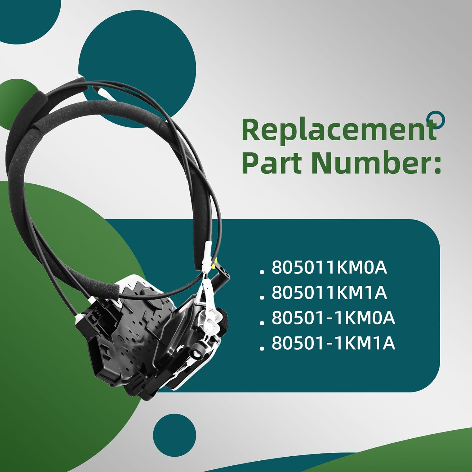 Installation Location: Front Left Driver Side Fitment: Power door lock actuator compatible with Juke 2011 2012 2013 2014 2015 2016 2017 Part Number: 805011KM0A, 805011KM1A, 80501-1KM0A, 80501-1KM1A Package: 1* Power door lock actuator