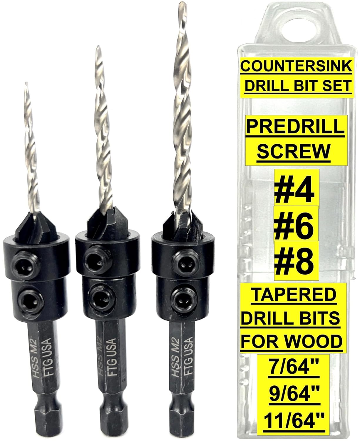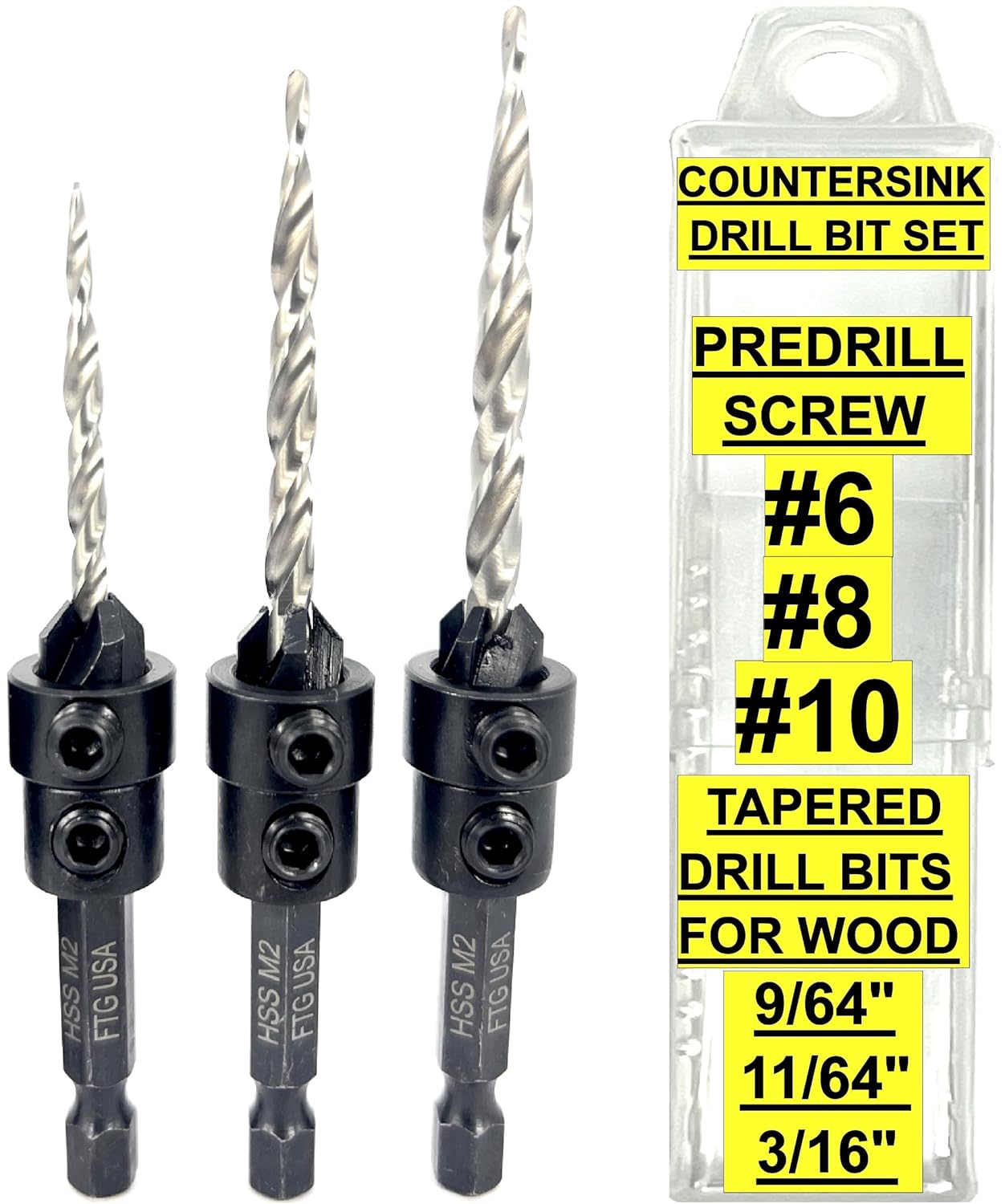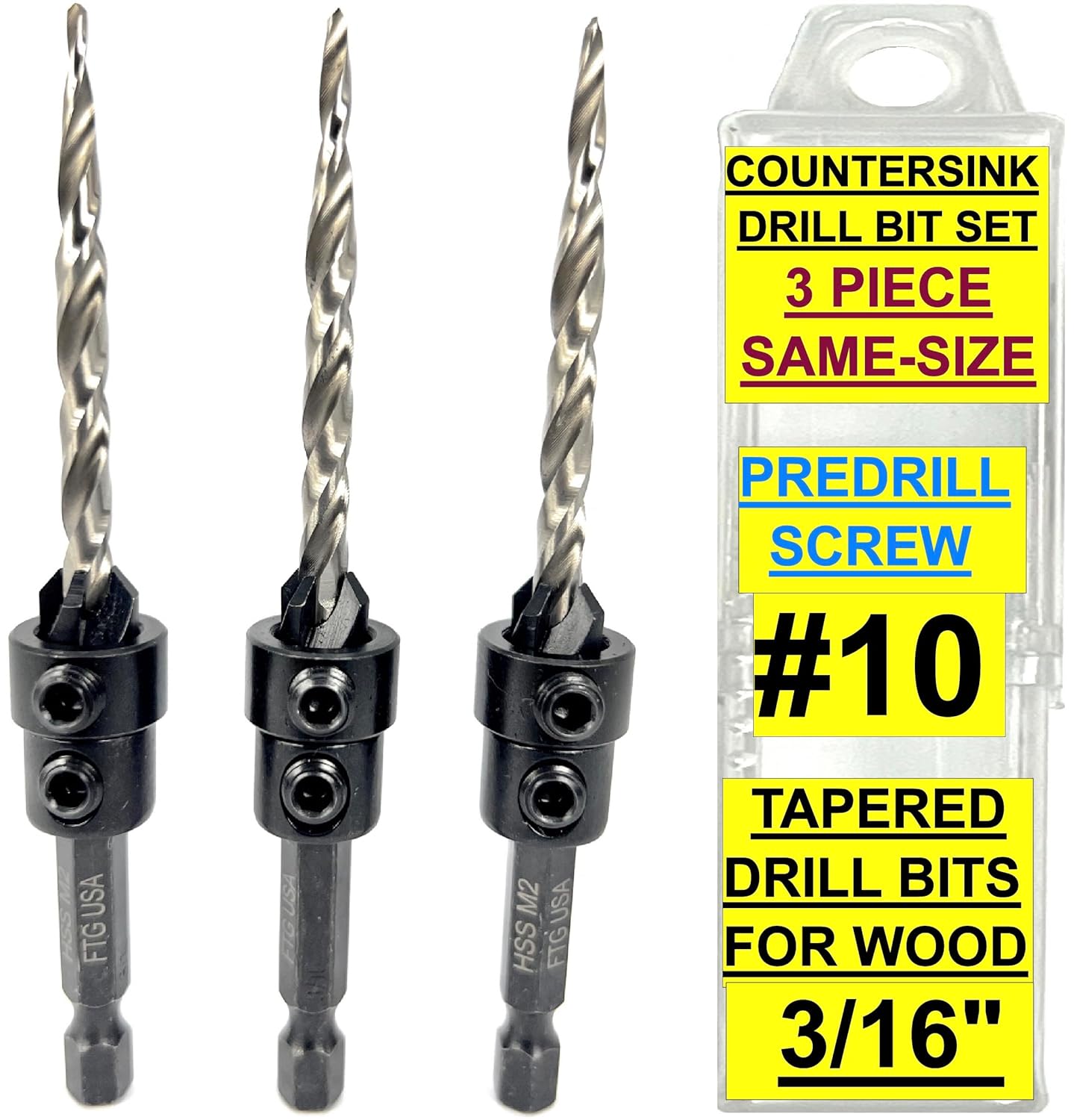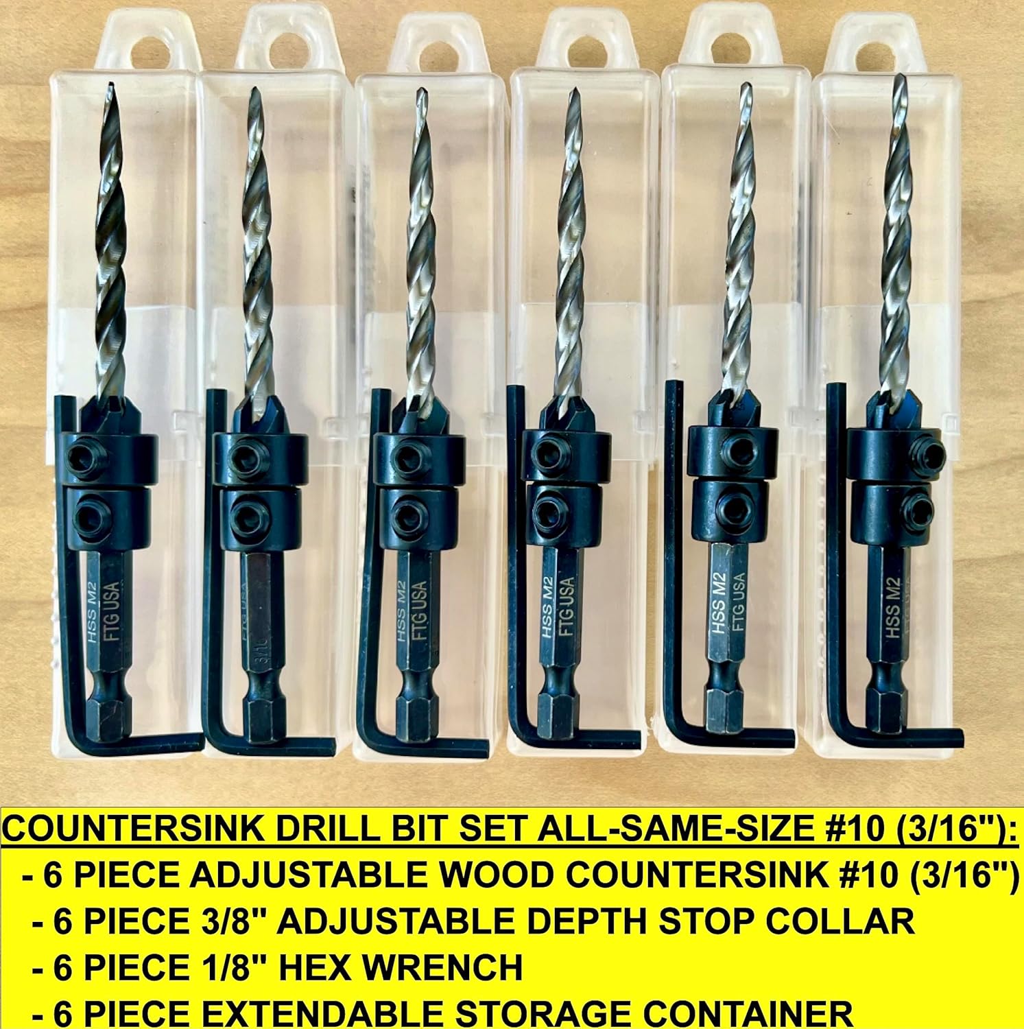 FTG USA 6 Piece All-Same-Size #10 (3/16") Counter Sinker drill bit set with Hex Wrench, Depth Stop Collar, and individual plastic container included for each countersink drill bit. Adjustable wood countersink set feature the best tapered drill bits 3rd Party Tested HSS M2, by far the most popular High-Speed Steel, Grade 6542, has superior properties, including high toughness, wear resistance, and good cutting retention. Counterbore size 3/8", Plug size 3/8". Super sharp, exceptionally durable, easy to use, and built to perform well in both hard and soft woods. Drill, countersink and counterbore in 1 step. Top quality material #45 Carbon Steel adjustable four-cutter counter bore chamfer angle 82-degree, attachment that cuts fast and clears chips quickly for fast, smooth countersinking applications. The counter bore feature attaches flats on shank with 2 hex screws for a secure fit and can be adjusted for controlled pilot hole depth providing a clean finish for more polished final products. Product Designed, Assembled and Packaged in Bloomfield, New Jersey by Fair Trade Group USA LLC from components manufactured in China to FTG USA specs. Packaging set combination/design protected by US Copyright Office
