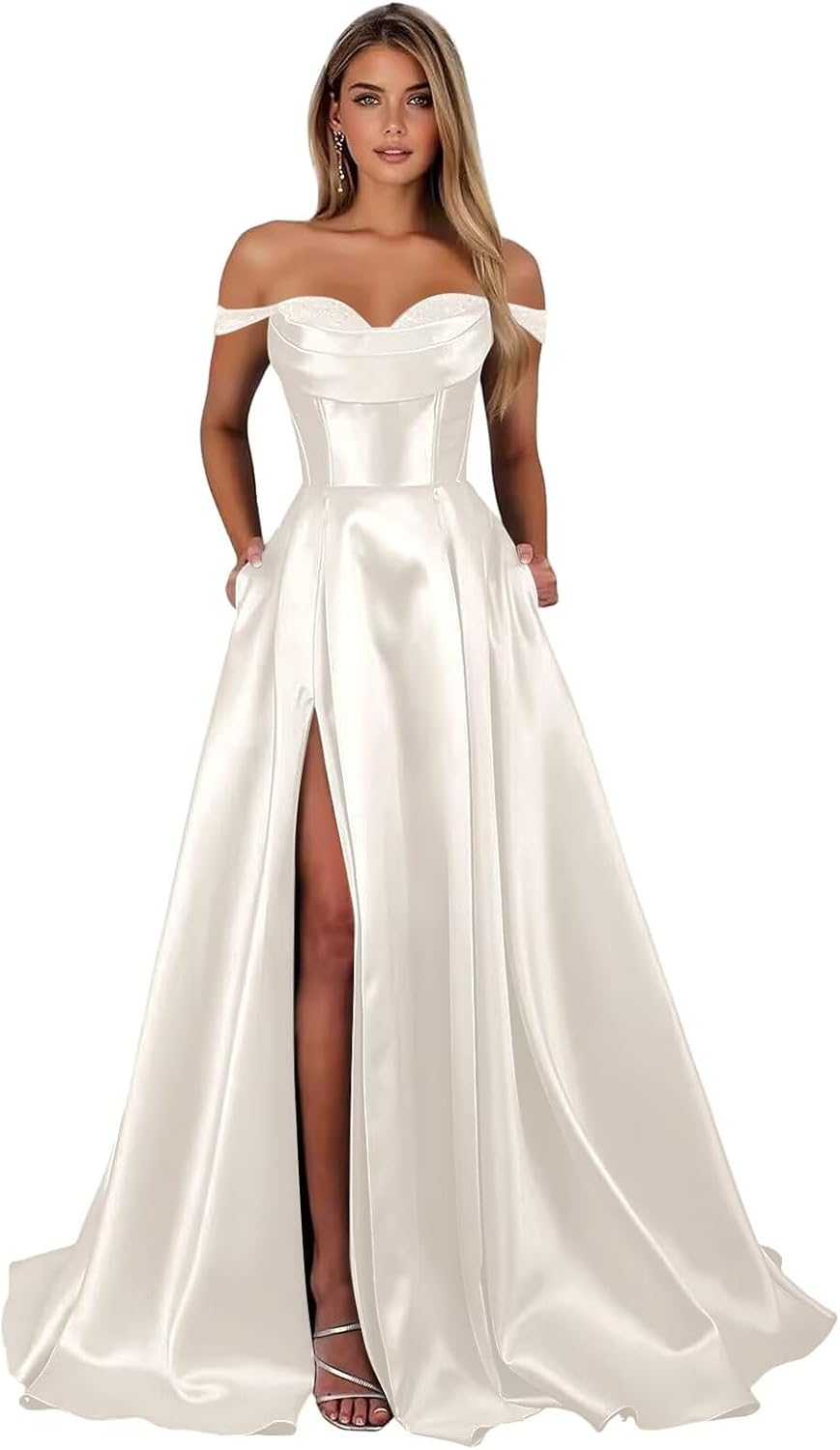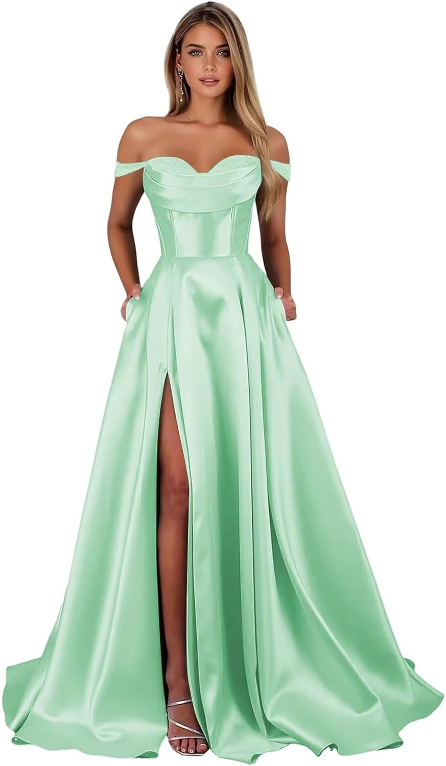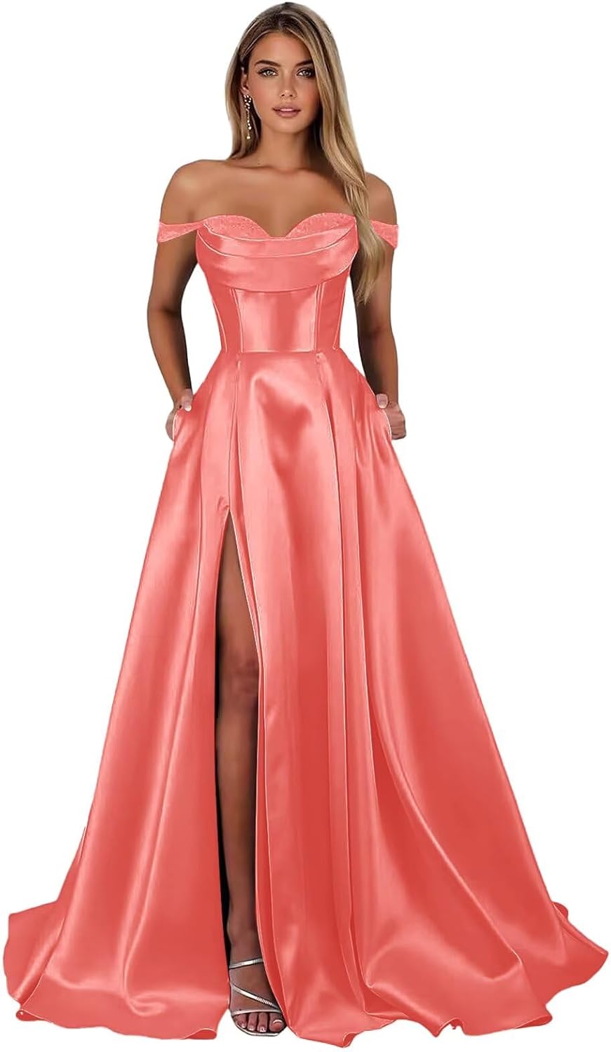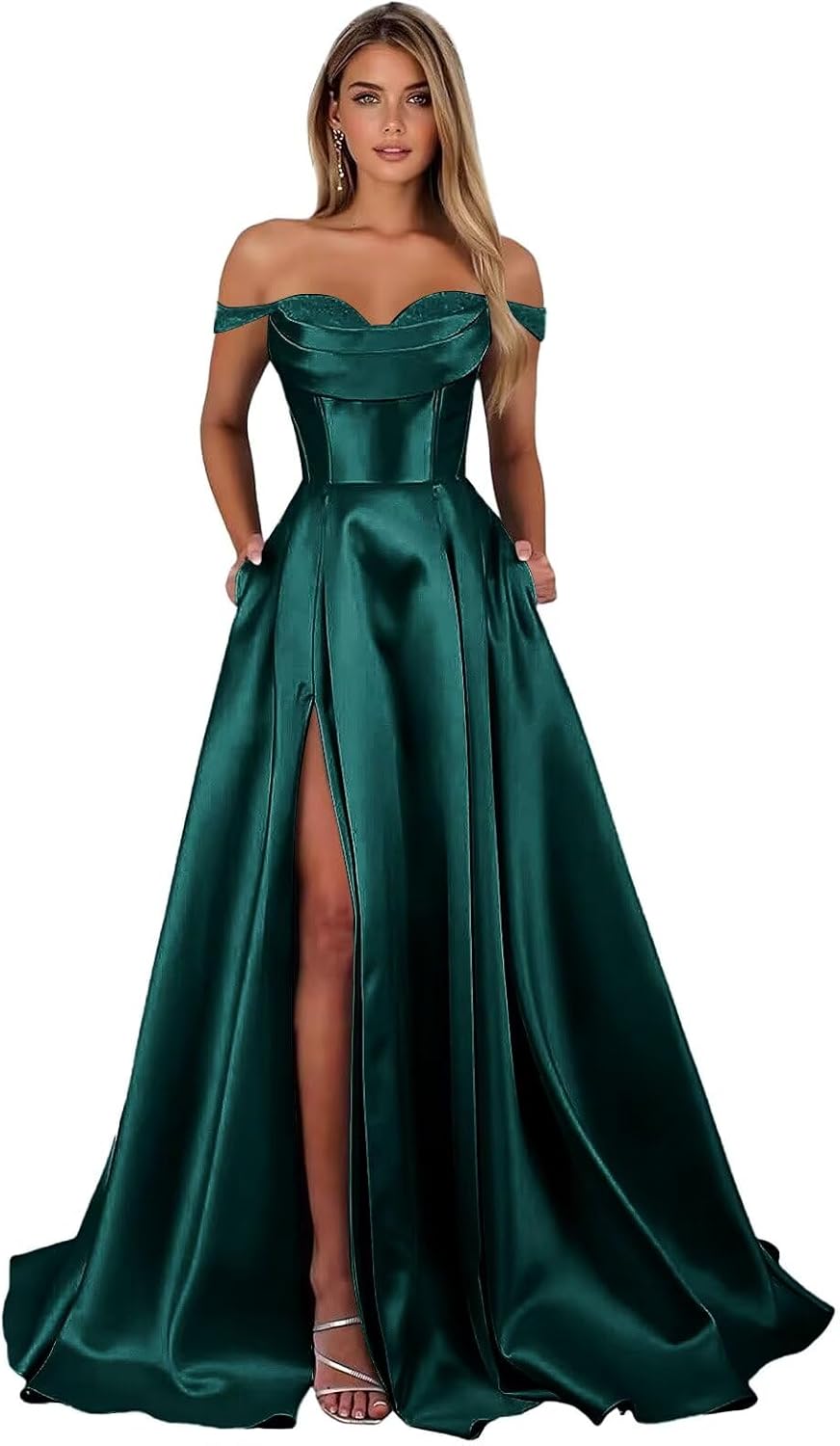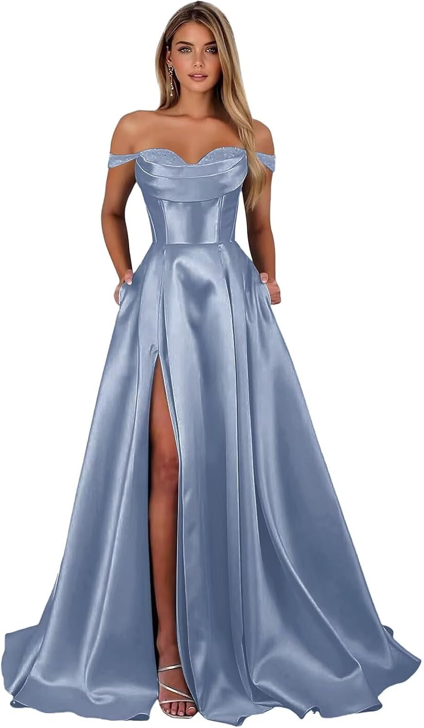 Off the Shoulder Satin Prom Dresses for Women with Slit A Line Pleated Corset Formal Evening Gowns with Pockets Fabric:Satin Dresses Length:Floor Length Neckline:Off the Shoulder Silhouette:A Line Embellishment:Pleated/Ruched Back Design:Corset Lace up Back Any Question You Have, Please Feel Free To Contact Us And We Are Glad to Help You.