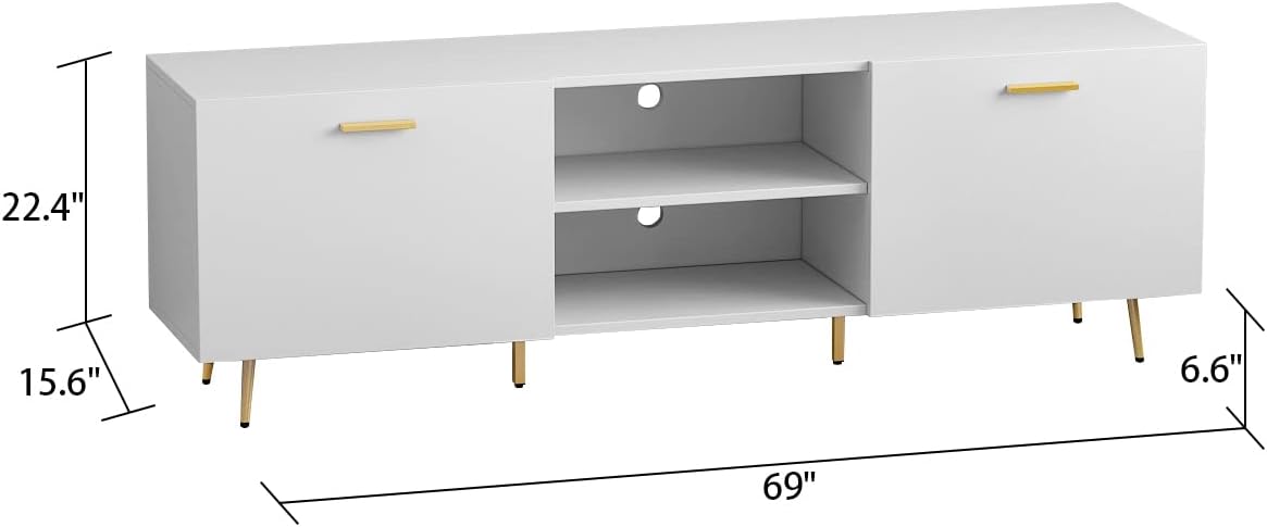 Description FUFU&GAGA TV stand will brighten your living room and keep it tidy. It comes with 2 cabinets and 2 open shelves, providing you with large storage space for your various items, such as magazines, cable boxes and video games. The size of our TV stands is thoughtful which is ideal for TV up to 65”. Moreover, it enjoys 2 cable management holes which are designed for easy wire feeding and it is convenient for you to open and close cabinets with handles on them. Elegant white makes the TV stand look elegant and classic, which helps it fit other furniture and decors in your living room, bedroom or somewhere else. Enjoy your happy and relax time with this entertainment center! Feature Constructed with quality MDF board, stable and durable Top board can hold up to 65” TV. Equipped with 2 doors and 2 open shelves, offering spacious storage space. 2 wire management holes make cables of audio video equipment neat and organized. Metal handles of cabinets contribute to easy opening and closing in your daily use. Suitable for living room, bedroom and so on, matching decors and furniture perfectly. Elegant and attractive appearance with modern design. Specification: Color: Elegant white Material: MDF board & Metal hardware Dimension: 69"(L) x 15.6"(W) x 22.4"(H)