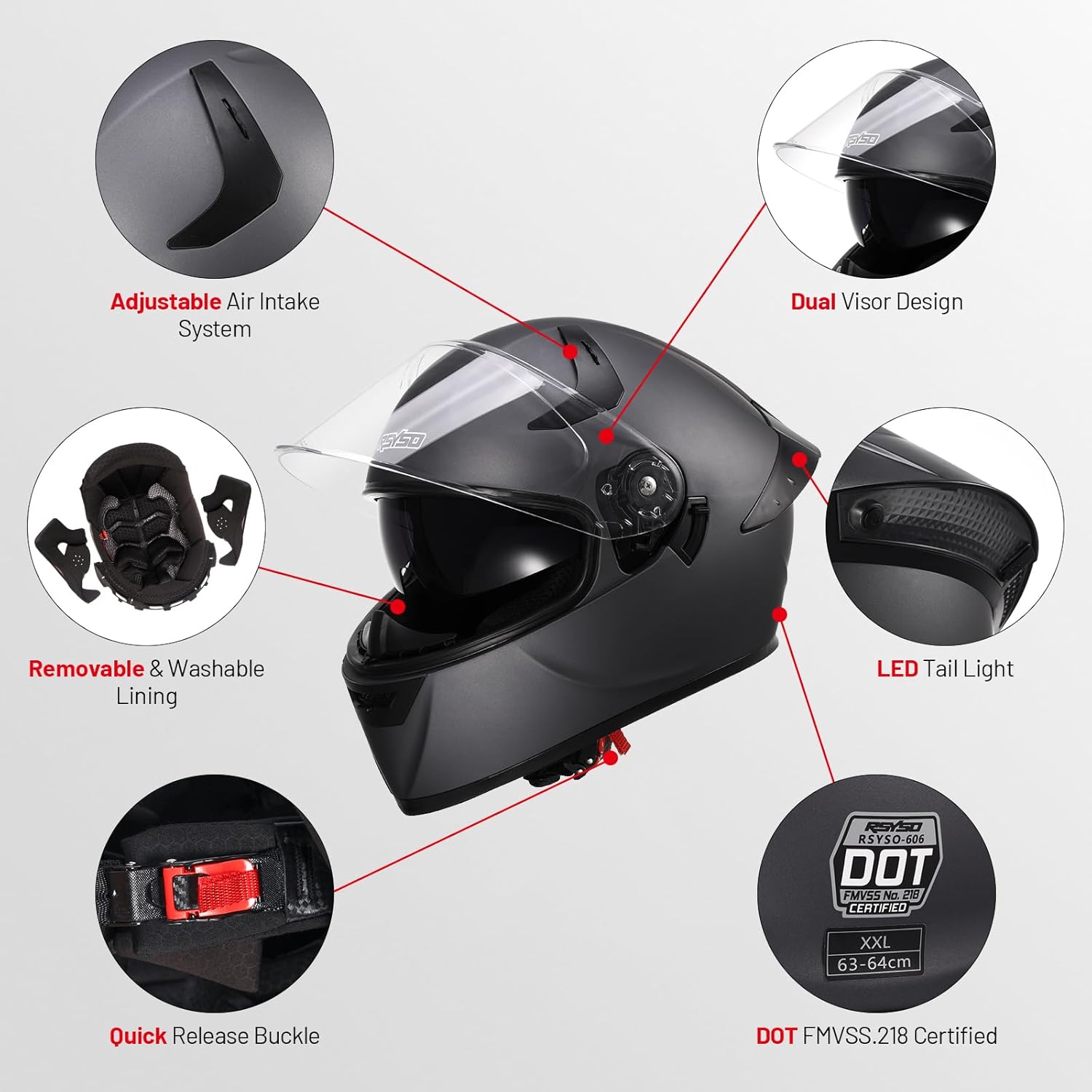 Helmet shell material: ABSExternal lens color: transparentInternal lens color: dark brownHelmet weight: 1700g ± 50gProvide size: M/L/XL/XXLSafety standards: DOT FMVSS218Packaging accessories: 1 helmet, 1 anti fog stickerLED lighting mode: constantly on, flashing, transparent