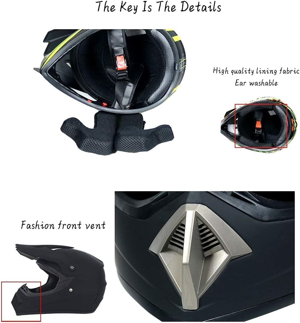 Full-Face Motocross Helmet set, YMKJGZS Off Road Crash Helmet Off Road Helmets: High quality materials that greatly reduce the damage caused by impact. Partial removable and washable lining to ensure helmet cleanliness and user health Comfortable driving experience, clear view and cool head. DOT / ECE certification Gloves: Breathable net construction Reinforced thumb and palm Safety wrist closure with Velcro construction Goggles: Clear vision lens Lightweight frame, comfortable to wear Adjustable anti-slip straps ensure a firm fit Specification: Material: ABS engineering plastic + EPS buffer layer Type: Motocross helmet Color: Matte black , Bright black , White Volume: 37 * 27 * 27cm Size: S = 52-53CM M = 54-55CM L = 56-57CM XL = 58-59CM Applicability: Unisex. Applicable Scene: Motocross / Mountain Bike / ATV / Off-Road / Endurance Race/ cross country/ streetbike/ Quad/ MTB/ downhill/ dirt bike/ BMX and more Package includes: 1 x Motocross helmet 1 x Goggles 1 x Gloves 1 x Masks Important Note: 1. Please allow 1-3cm error due to manual measurement and make sure you do not mind before ordering. 2. Please understand that color may be a little different due to monitor and light brightness from pictures. If you do not receive the goods on time, please contact us, do not put forward disputes. If you are satisfied with the goods, please give us five stars. Welcome to our store, YMKJGZS may you have a pleasant shopping experience! If you have any problems about our products, please feel free to contact us at any time, we will try our best to help you, thanks in advance!