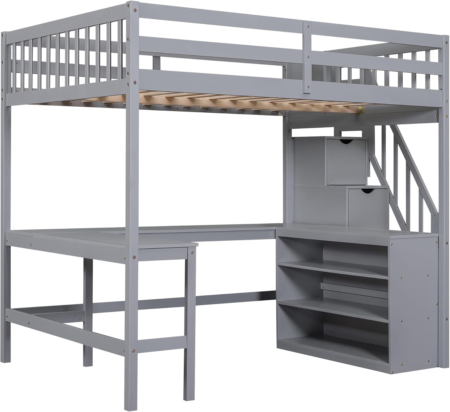 Full Size Loft Bed - Solide Wood Loft Bed Frame with Built-in Desk, 3-Tier Shelves and Storage Staircase, High Full Loft Bed with Slat Support & Guardrails, Space Saving Design for Bedroom, Gray