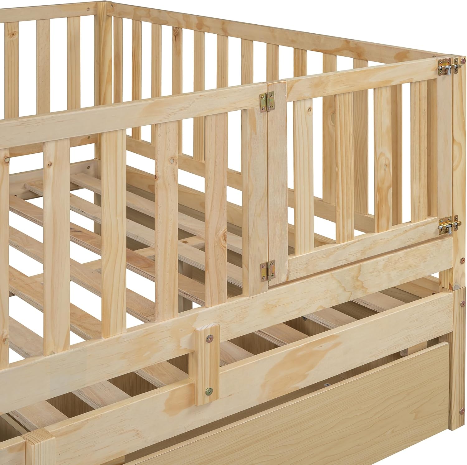 Full Size Wood Daybed Frame with 2 Storage Drawers and Lockable Fence Guardrails, Split into Independent Floor Bed & Daybed, No Box Spring Needed, Natural
