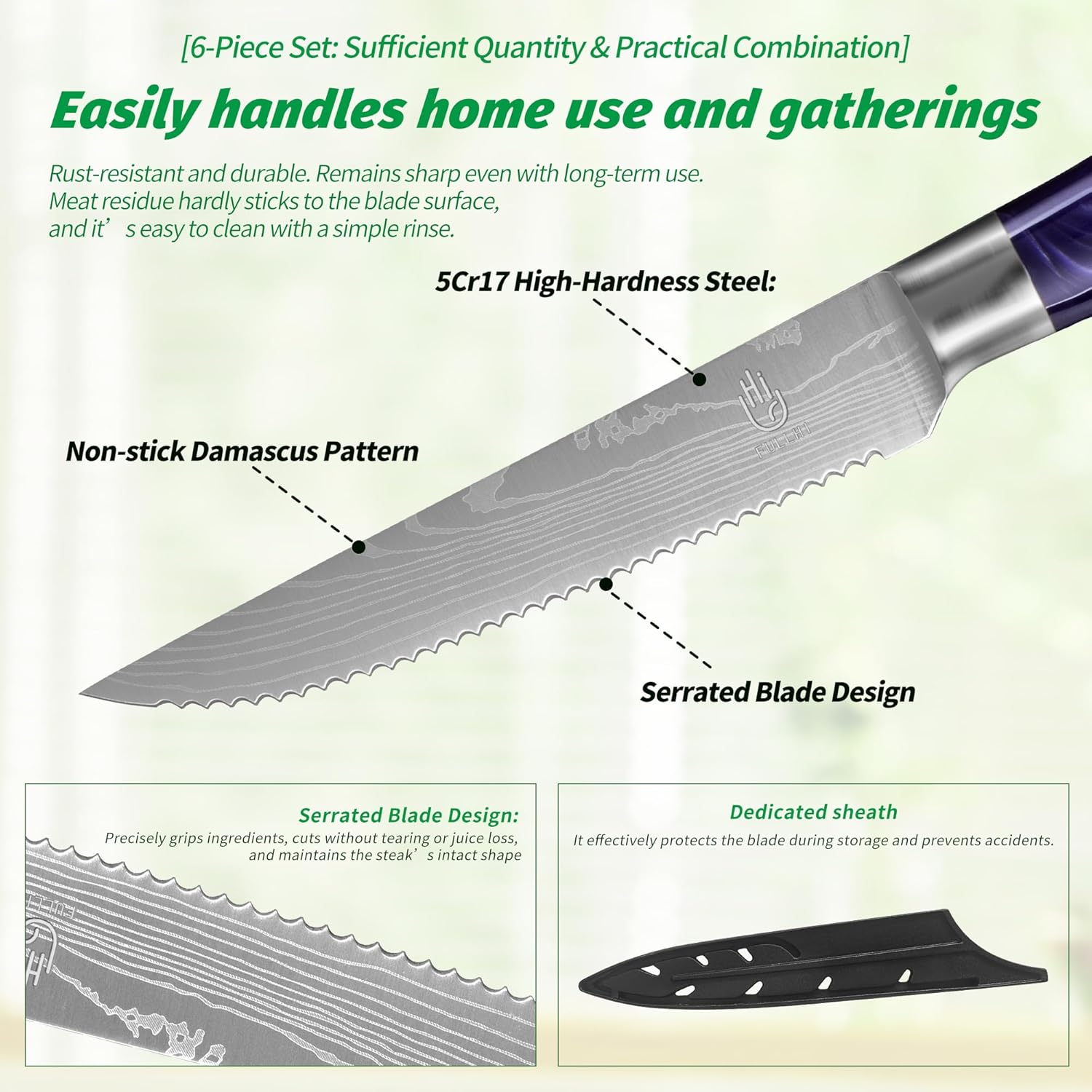 ALL-INCLUSIVE Block KNIVES SET: 1 Knife Block Holder, 8" Chef Knife, 8" Slicer Knife, 8" Bread Knife, 7" Nakiri Knife, 6" boning Knife, 3.5" Paring Knife, 1 kitchen Scissors, 6pcs Steak Knives with roll bag. Whether cooking at home or outdoors, it can meet your needs. The knife holder is a thickened plastic knife block, sturdy and durable, washable for easy cleaning.