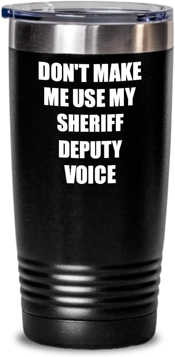 Funny Sheriff Deputy Tumbler Coworker Gift Gag Saying Don't Make Me Use My Voice Insulated With Lid Cup Black 30 Oz SATISFACTION GUARANTEED: Absolutely love your order or contact us and we'll make it right. Your satisfaction is 100% guaranteed. HIGHEST QUALITY TUMBLER & UV PRINTING: This large 30 Ounces stainless steel with powder coating tumbler is professionally printed on one side with high-quality ink and techniques to ensure you the best quality on the market. BEST GIFT IDEA: High-quality & funny insulated tumblers, travel mugs, or car commuters, make a great useful present for women, men, friends, family, coworkers, or anyone you're thinking of! Our huge commuter cups with lid are perfect for any occasion, birthday, anniversary, retirement, Mother's Day, Father's Day, Christmas, or just please yourself! Ideal for outdoor activities or indoors at house or the office. ORIGINAL DESIGN, PROUDLY PRINTED AND SHIPPED FROM USA.