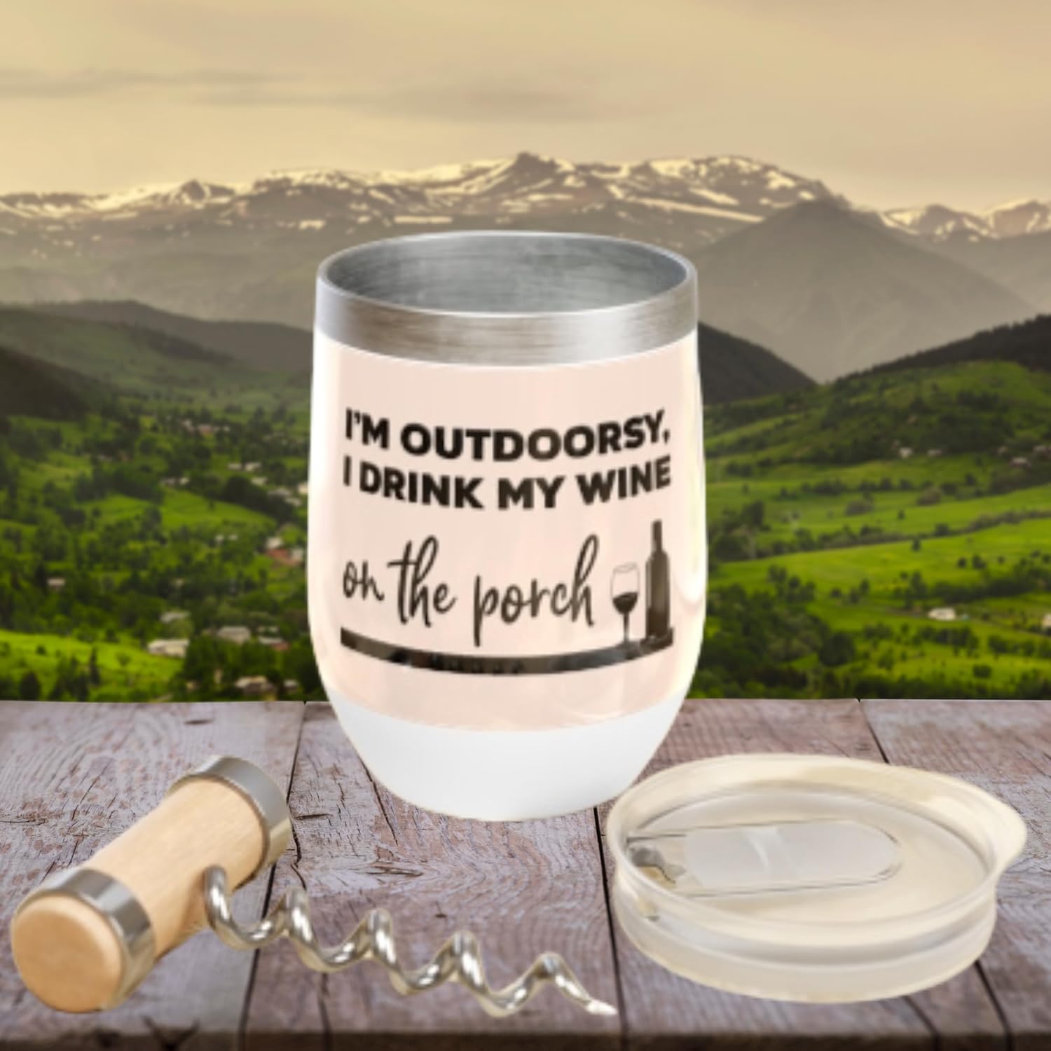 Celebrate the simple joys of life with our 12 oz. Stainless Steel Insulated Tumbler, featuring the humorous phrase: "I'm Outdoorsy, I Drink My Wine On the Porch." Perfect for those who love to relax and enjoy their favorite wine outdoors, this tumbler combines style, practicality, and a fun sense of humor. Constructed from high-quality stainless steel, this tumbler is designed to last and keep up with your laid-back lifestyle. Its double-wall insulation keeps your hot beverages warm for up to 6 hours and your cold drinks chilled for up to 12 hours, making it perfect for a cozy morning coffee or a refreshing glass of wine on the porch. The 12 oz. size is ideal for all your favorite drinks and fits comfortably in your hand and most cup holders, making it perfect for use both at home and on the go. The witty phrase "I'm Outdoorsy, I Drink My Wine On the Porch" adds a touch of personality to your drinkware collection, making this tumbler a great gift for friends, family, or anyone who loves to unwind with a glass of wine and a view. The secure, spill-resistant lid allows you to relax without worrying about spills or leaks, whether you're enjoying a sunset or a good book. This tumbler is not only fun and stylish but also environmentally friendly. Itโs reusable and easy to clean, offering a sustainable alternative to disposable cups. The durable construction ensures it can handle your laid-back outdoor moments and more. Embrace the joy of outdoor relaxation with our 12 oz. Stainless Steel Insulated Tumbler. Perfect for wine lovers who enjoy their time on the porch, itโs the ideal way to keep your drinks just right while you enjoy the fresh air. Order yours today and make every sip a celebration of the simple pleasures in life!