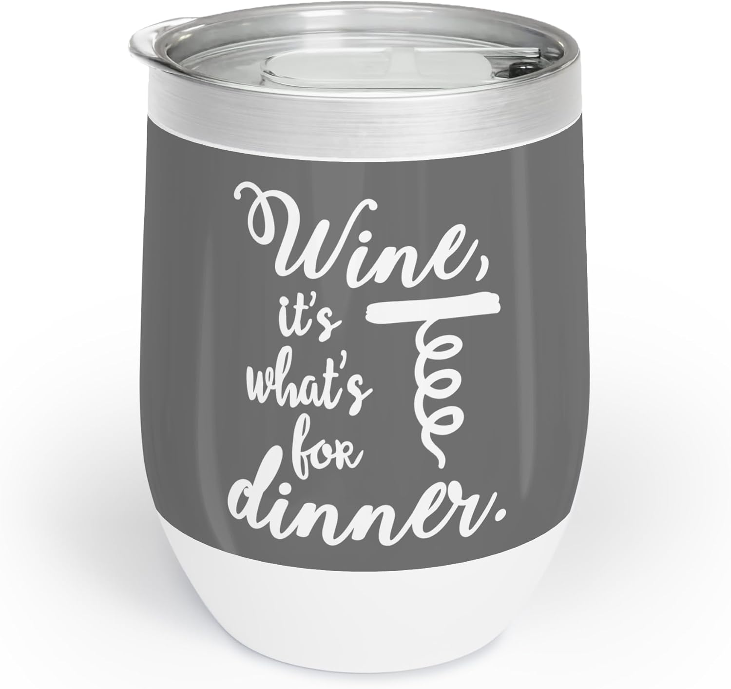 Add a touch of humor to your evenings with our 12 oz. Stainless Steel Insulated Tumbler, featuring the cheeky phrase: "Wine, It's What's for Dinner." Perfect for wine enthusiasts who love to unwind after a long day, this tumbler is designed to keep your favorite drinks at the perfect temperature while adding a fun twist to your drinkware collection. Crafted from premium stainless steel, this tumbler is both durable and stylish. Its double-wall insulation technology keeps your hot beverages warm for up to 6 hours and your cold drinks chilled for up to 12 hours. Whether you're savoring a morning coffee or relaxing with a glass of wine at dinner, this tumbler ensures your drinks stay just the way you like them. The playful saying, "Wine, It's What's for Dinner," is sure to bring a smile to your face and makes this tumbler an excellent gift for friends, family, or anyone who appreciates a good laugh with their wine. The 12 oz. size is perfect for a variety of beverages, and the spill-resistant lid provides peace of mind, allowing you to enjoy your drink without worrying about spills. Designed for both functionality and fun, this tumbler is reusable, easy to clean, and environmentally friendly—an ideal alternative to disposable cups. Its sturdy construction ensures it can handle your everyday adventures, from dining al fresco to cozy nights in. Bring a bit of humor to your daily routine with our 12 oz. Stainless Steel Insulated Tumbler. Whether you're toasting to a special occasion or simply enjoying a quiet dinner at home, this tumbler makes every moment a little more delightful. Order yours today and toast to the simple pleasures of life with style and a smile!