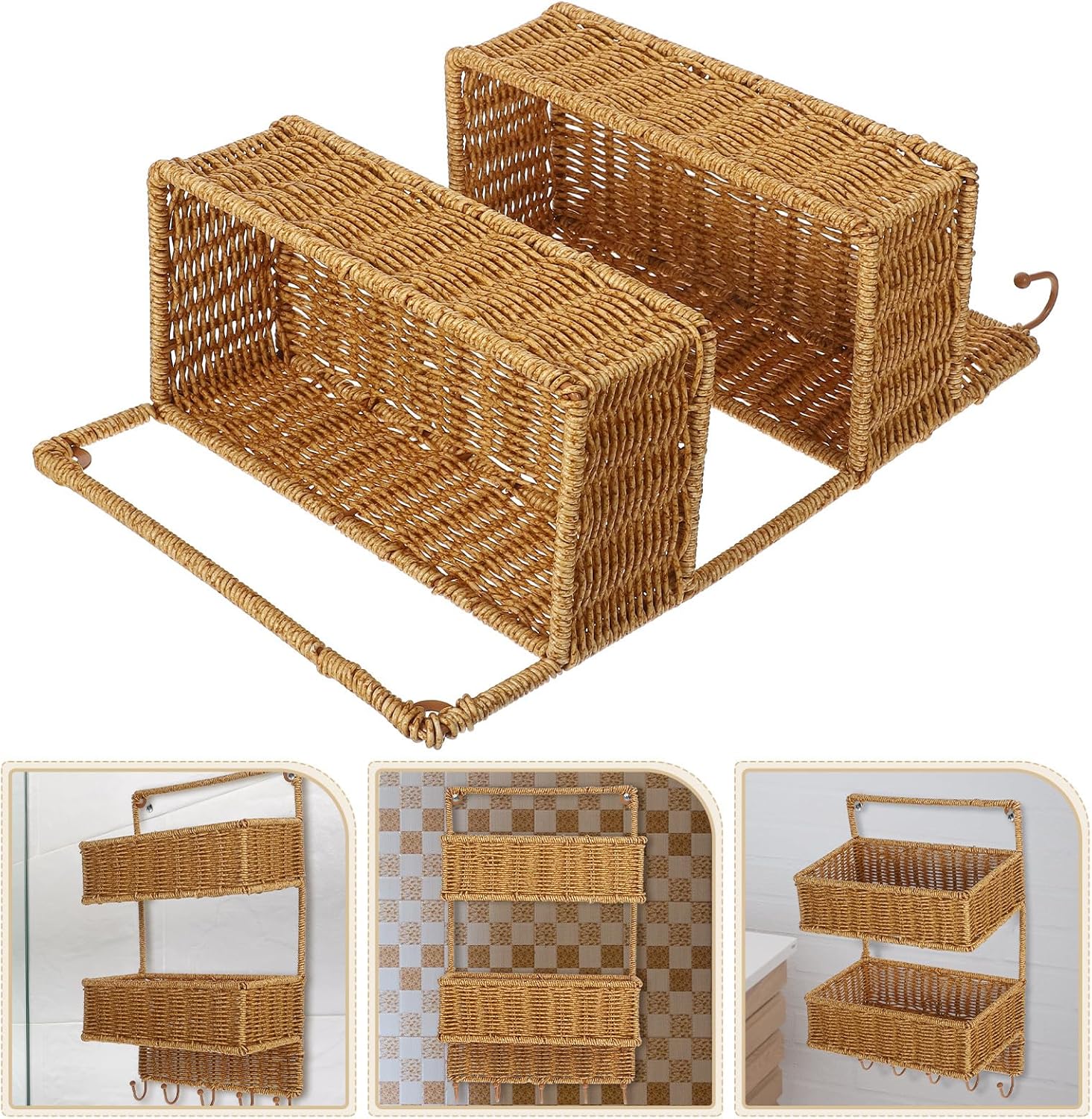 Package Include1 x wall basketCharacteristics-Material:Plastic-Color:Light Brown-Size:42.50X25.50X13.00cm/16.70X10.02X5.11in- Made with plastic material, this storage basket is and reliable, ensuring use.Goods DescriptionThis woven basket simulation rattan fruit basket hanging storage basket combines practicality with style, crafted from plastic in light brown tone that mimics natural rattan textures. Its multi-tiered wall-mounted design maximizes storage by providing two spacious shelves and convenient hooks, making it suitable for organizing fruits, vegetables, toiletries, or small household items. Installation is straightforward and does not require drilling, which helps maintain wall surfaces and speeds up setup. Ideal for kitchens, bathrooms, or vanity areas, this hanging basket supports a clutter-free environment by keeping essentials within . The sturdy plastic construction reliability while contributing to warm, natural aesthetic that fits seamlessly into various home settings. Whether used as kitchen hanging basket or bathroom storage basket, it helps users create an orderly space that enhances everyday living with functional elegance.From was inspired by need to blend practical storage with elegant design in everyday living spaces. Focusing on materials and versatile solutions, each product transforms cluttered areas into organized havens. Experience convenience and style with , where thoughtful design meets daily life.
