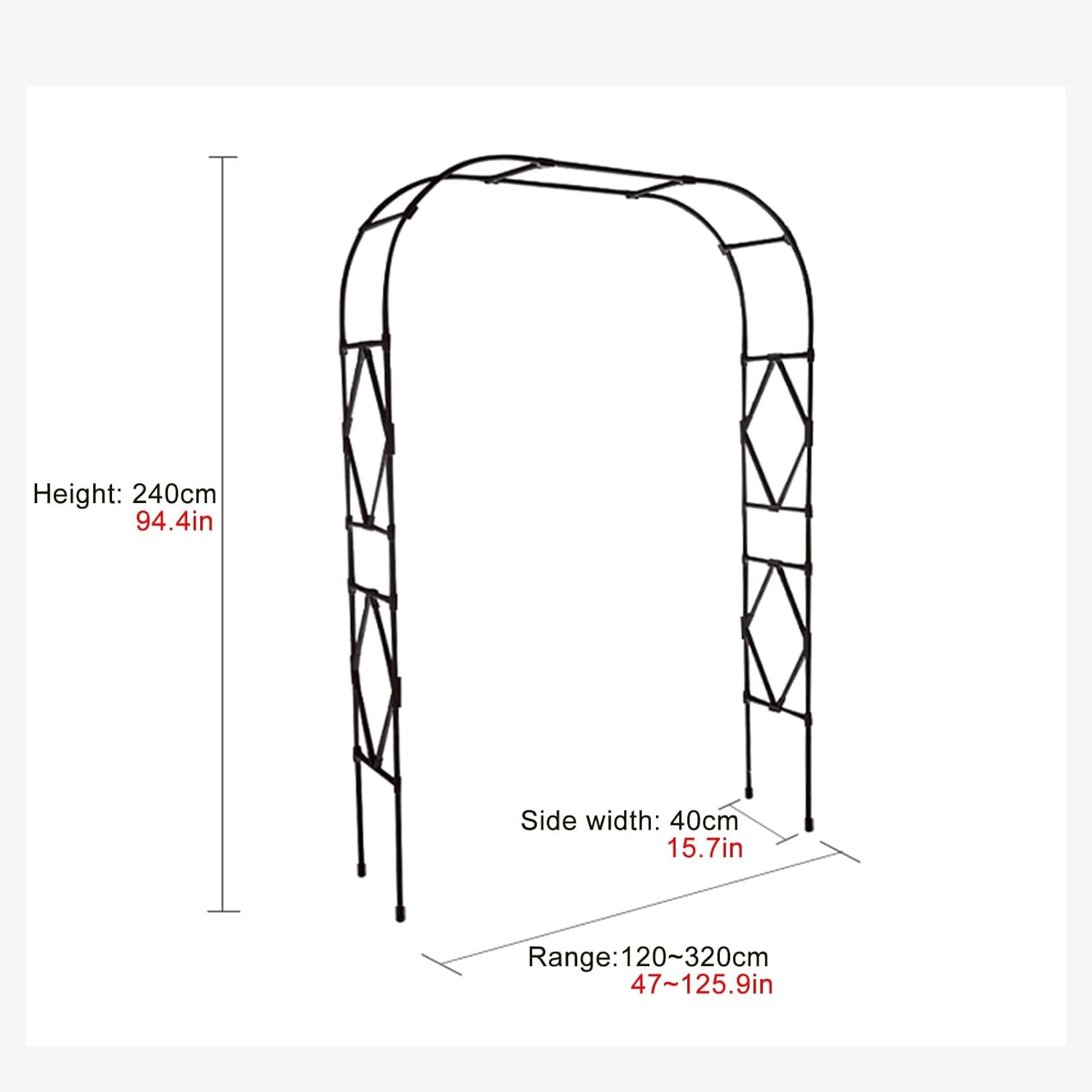Placing an arch part way down a path adds interest and flow to that garden journey.You can apply several of our garden arbors to create an adorable aisle.From climbing plants to hanging ornaments, this steel arbor is more than enough for all your needs.Specification:Name: Decorative Garden ArchColor: Black , WhiteMaterial: steelPipe diameter: 20mmSize: ( W x H)120x240cm(W47xH94.5in)150x240cm(W59xH94.5in)180x240cm(W71xH94.5in)200x240cm(W78xH94.5in)210x240cm(W82.6xH94.5in)220x240cm(W86xH94.5in)230x240cm(W90.5xH94.5in)240x240cm(W94xH94.5in)250x240cm(W98.4xH94.5in)280x240cm(W110XH94.5in)300x240cm(W118XH94.5in)320x240cm(W125.9xH94.5in)Side width: 40cm/15.7inNotice:* If a flower stand is used, it should be used in the current season. In the season when the flower stand is not needed, the flower stand can be removed and placed in a dry and ventilated place. Because it can prolong the service life of our flower stand.* Due to the manual measurement of the size, there may be an error of 1 to 3 cm. Please refer to the actual product. Thank you for your understanding.* Although we display the closest color possible, due to differences in computer monitors, there are likely to be some color variations.* If you have any questions, please contact us immediately and we will reply you within 24 hours.