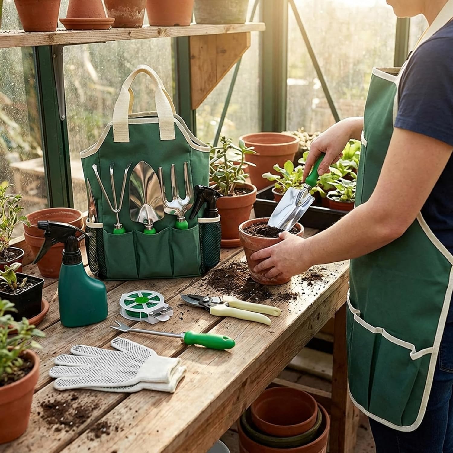 Description: This 11-piece gardening tool set is designed with heavy-duty stainless steel heads built to withstand rust, corrosion, and harsh outdoor conditions, providing a solution for all your gardening needs. The ergonomic handles feature anti-slip grip and spring-assisted pruning shears, boosting comfort and reducing hand strain during extended use. This comprehensive kit includes all essential tools for planting, cultivation, trimming, and maintenance, such as various trowels, forks, pruning shears, gloves, a spray bottle, apron, and a spacious Oxford storage bag, ensuring everything you need is in one convenient set. Thoughtfully organized with a large storage bag and multi-pocket apron to keep tools tidy and accessible, it enhances mobility and efficiency whether in the garden, yard, or greenhouse. Sized for both adults and children, this garden tool set promotes family gardening activities and hands-on engagement with nature, making it ideal for bonding, cultivating skills, and fostering a love of the outdoors. Whether you're a beginner or experienced gardener, this gardening kit meets your demands for quality, convenience, and versatility. Features:. -Color: Green. -Material: Stainless steel. Note:Manual measurement, please allow slight errors on size.The colors may exist slight difference due to different screens. Package Including 1 * Garden Tool Set