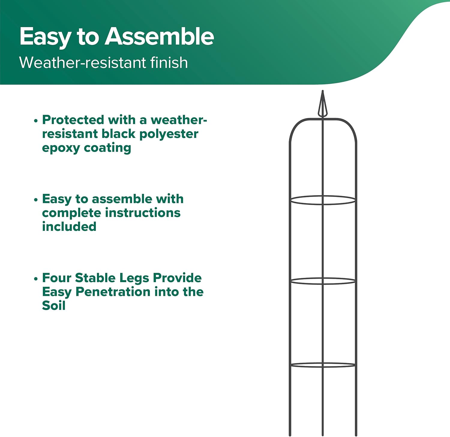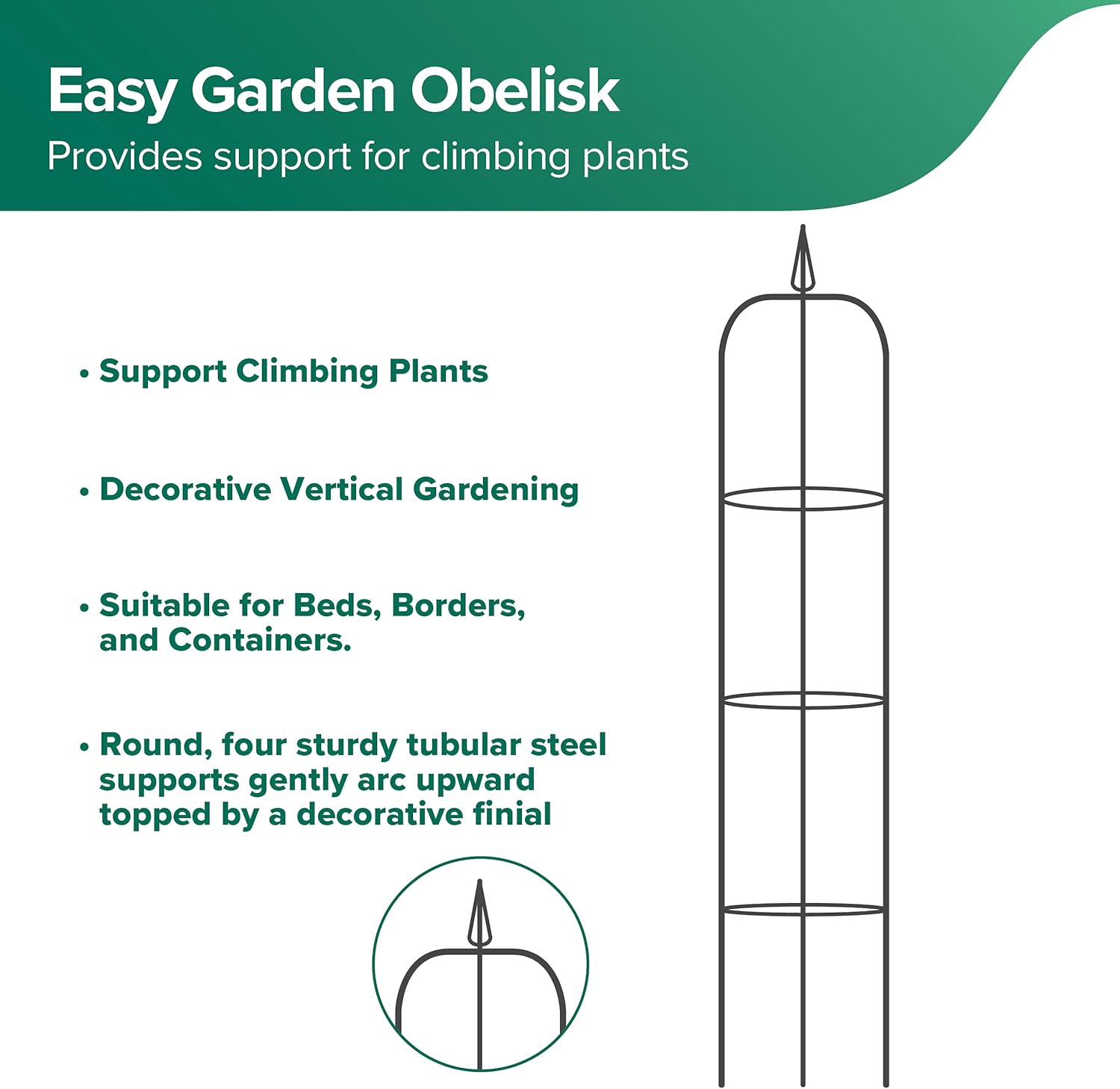 Gardman R07701 Decorative Easy Garden Obelisk. Support climbing plants while adding height and variety to your garden with this robust obelisk. Features four sturdy tubular steel supports gently arc upward topped by a decorative finial. The Easy Garden Obelisk is suitable for garden beds, borders, containers, planters, yards, terrace, deck or patio. Train your plants and vines like clematis, climbing roses, morning glories, beans, sweet peas, tomatoes, and more to grow through the obelisk by weaving them in and out of the structure as they grow. Decorate for special occasions. Durable and protected with weather-resistant, polyester epoxy coating and black coloration that will blend in with any surrounding. Simple to assemble with all instructions included. Four stable legs provide easy penetration into the soil. Dimensions: 13 diameter x 75 high. Gardman, Bring your garden to life.
