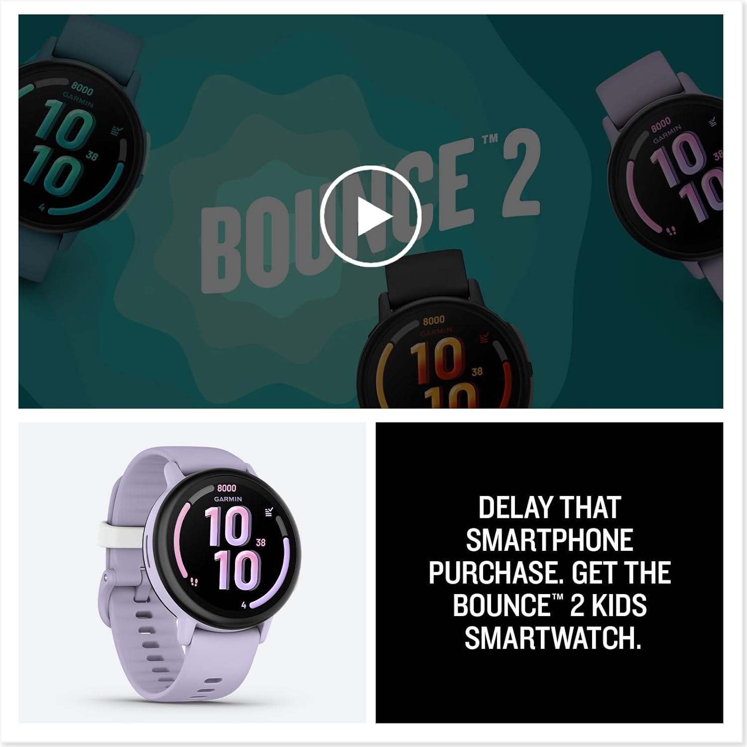 Bounce™ 2 is the kids smartwatch with two-way calling, text messaging and real-time location tracking that parents have been waiting for (an active subscription and LTE connectivity are required). Kids can track their activity, listen to music (subscription required) and even manage chores and rewards — all on a bright, colorful AMOLED display smartwatch that’s swim-friendly. Parents will love the Garmin Jr.™ smartphone app that allows them to keep track of, and chat with, their child. Up to 2 days of battery life will keep Bounce 2 off the charger and on their wrist longer (connected feature use significantly impacts battery life). And preloaded sports apps and step tracking will help keep kids active.