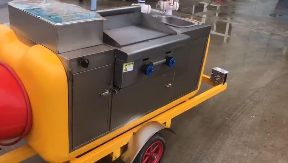 BRAND NEW WE CAN UPGRADE TO QUADRUPLE SINKS or ADD A DEEP FRYER (upcharge applies) CAN BE USED TO MAKE ALMOST ANY HOT FOOD LIKE HOTDOGS, TACOS, BURGERS, ETC..... MATERIAL: STAINLESS STEEL & FIBERGLASS INCLUDES: Hot/Cold Water System, STEAMER PANS, GRIDDLE, SINKS, AND UMBRELLA WEIGHT: 200KGS SIZE: 230X80X90CM Standard equipment Wheel: single-axle tires : 2×13C (2 sets) Tow bar: tractor tow bar with safety ball headed coupling Chassis: fiberglass with stainless steel Trim. High visibility, ultra bright tail light signal system Cart Body: high quality stainless steel, Dry Storage Top side display area plus additional under counter dry storage. Water Cycle system: one sink with hot and cold water taps, a fresh water tank, a waste water tank, 12V mini water pump, 12V battery, and on/off control switch Umbrella