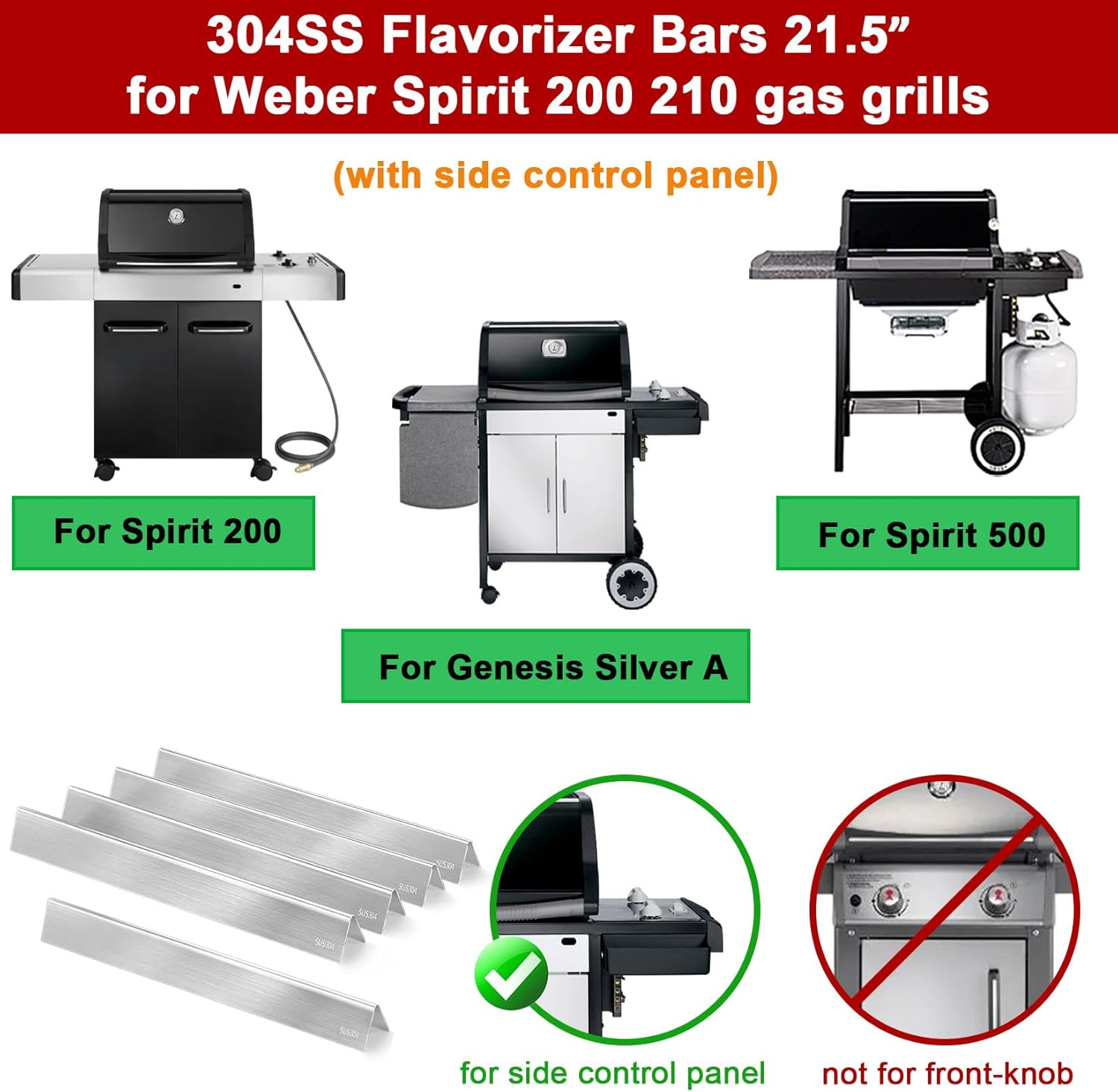 Grill parts kit includes 5 pcs stainless steel flavorizer bars and a set of stainless steel burner tube. Flavorizer bars dimensions: 21.5"L x 1.7"W x 1.7"H. Burner tube dimensions: 27 inches long, crossover burner 10 1/2 inch. Flavorizer bars material: 304 Stainless Steel. Burner tube set material: Stainless Steel. Durable and corrosion resistant material. Parts kit fits for Weber Spirit S-200(2009-2012), Spirit S-210(2009-2012), Spirit E-210(2008 & Older), E-210NG, Genesis Silver A, Genesis Spirit 500. Parts kit replace for Weber 7534/7535 & Weber 7507. Parts kit fits for Weber models: 2241298, 2241398, 2241411, 2271001, 2271398, 2271411, 2271698, 2341001, 2341298, 2341398, 2341411, 2371398, 2371411, 2371698, 3711001, 3811001, 4411001,4411411, 4511001, 46100001, 47100001, 6211001, 6211398, 6211411, 6311001, 6311398, 6311411, 6311001, 6311398, 6311411, 6711001, 6711301, 6711411, 6811001, 6811301, 6811411, 77924014390. Sold heat shield plates and burner tube in a set, one-stop shopping, get what you need in a decent price to renew your grill. Aftermarket replacements, please double check the size and shape of your original parts before you order.