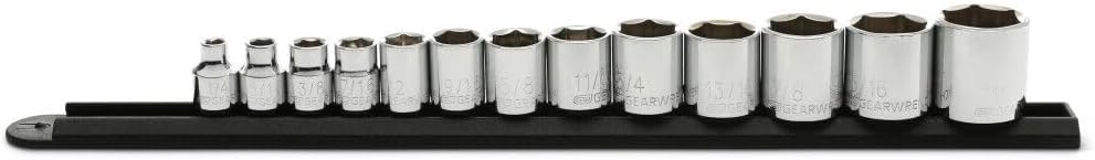 Product Description The GEARWRENCH 80553 13 Piece 3/8-Inch Drive 6 Point Standard SAE Socket Set features sockets made of fully polished, nickel chrome plated alloy steel. Large hard-stamped part numbers and size on both sides of the socket allow for easier viewing of the socket sizes, and double lines make it easy to identify SAE vs. metric sockets. A turn down at the base of each socket provides excellent grip surface to pull the sockets off the ratchets. This set includes 3/8-inch drive, 6-point sockets packaged on a clip rail. This KD Tool set is covered by a lifetime manufacturer's warranty.What's in the Box 1/4-to-1-inch 3/8-inch drive 6-point standard sockets on a storage rail. From the Manufacturer The KD Tools 80553 13 Piece 3/8-Inch Drive 6 Point Standard SAE Socket Set features sockets made of fully polished, nickel chrome plated alloy steel. Large hard-stamped part numbers and size on both sides of the socket allow for easier viewing of the socket sizes, and double lines make it easy to identify SAE vs. metric sockets. A turn down at the base of each socket provides excellent grip surface to pull the sockets off the ratchets. This set includes 3/8-inch drive, 6-point sockets packaged on a clip rail. This KD Tool set is covered by a lifetime manufacturer's warranty.What's in the Box 1/4-to-1-inch 3/8-inch drive 6-point standard sockets on a storage rail.