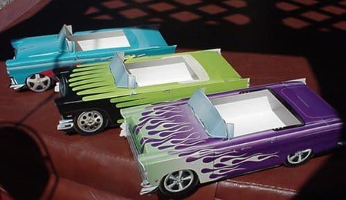 All are gorgeous cars ... a very realistic and clever item ... they are highly detailed paperboard cars. They measure about 11" long, 4 1/2" wide and 2 1/2" high. They can be used to put snacks into, as a business card holder, table toppers, party favor or they just look great on display. Sorry, the burger and fries are NOT INCLUDED. Cars will be shipped flat with easy assembly (folding) instructions included. You will receive 36 cars, the pictures show only a few of the cars ... some of the cars in the collection are as follows ... 1955 Ford Fairlane ... 1956 Ford ... 1957 Ford 1955 Ford Hot Rod ... 1956 Ford Hot Rod ... 1957 Ford Hot Rod 1956 Pink T-Bird ... 1956 Blue T-Bird ... 1958 Edsel ... 1964 Mustang 1955 Chevy ... 1956 Chevy ... 1957 Chevy 1955 Chevy Hot Rod ... 1956 Chevy Hot Rod ... 1957 Chevy Hot Rod 1958 Corvette ... 1958 Buick You will receive 2 of each car. NO SUBSTITUTIONS PLEASE The baby boomers will love this item! We have this item in sets of 18 cars and 54 cars.