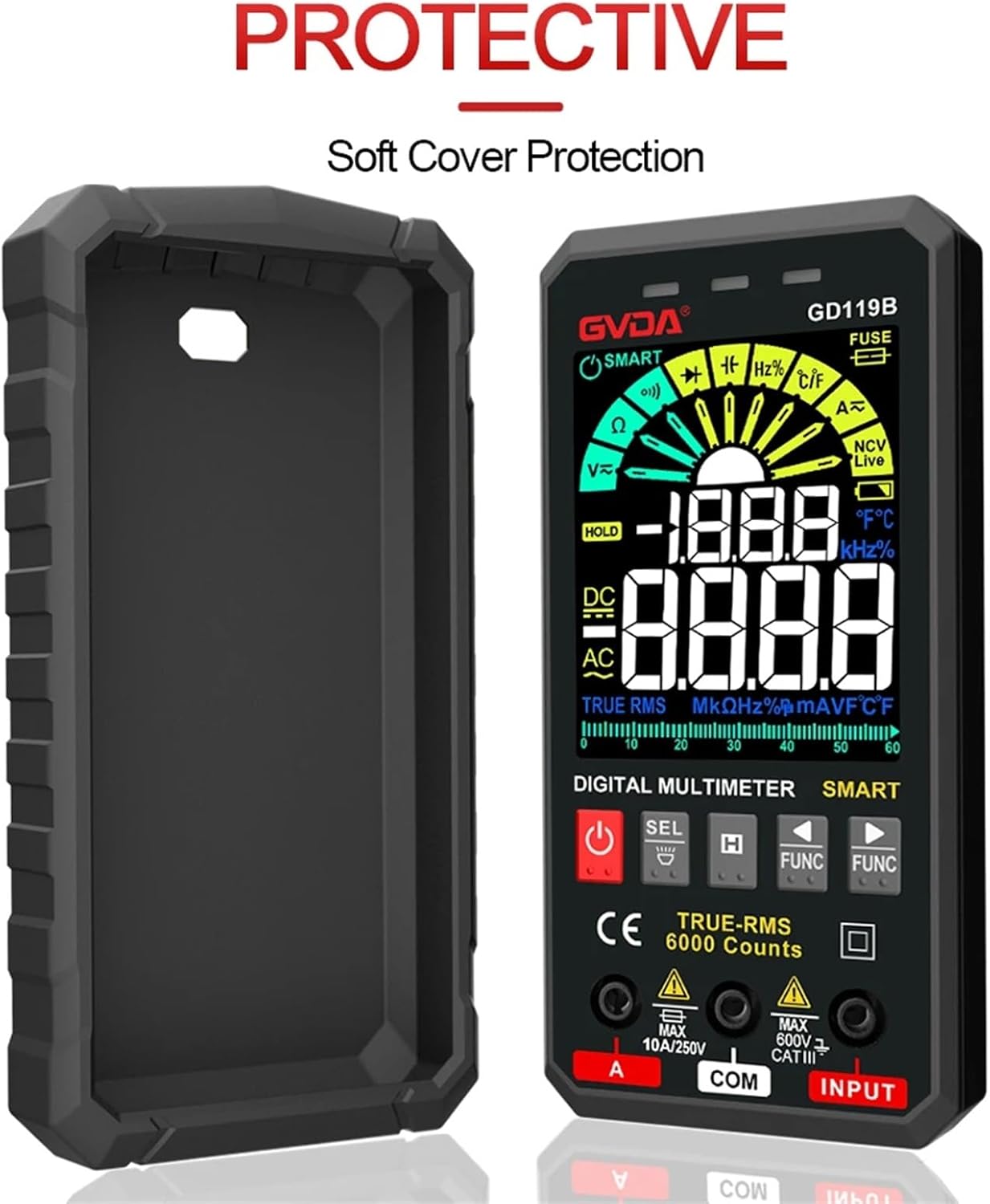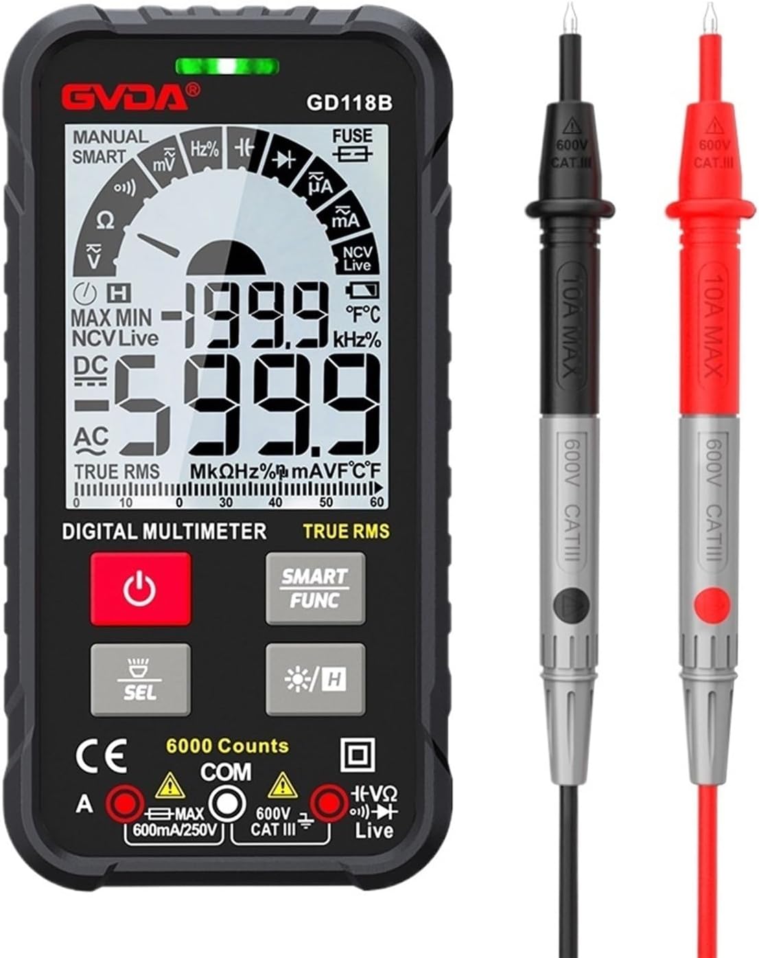 Multimeters & Analyzers6000 Counts Smart Multimeter Digital True RMS Auto Range 600V 10A Tester Ohm Hz Capacitance REL AC DC DMM MultitesterGVDA Multimeter is an intelligent true effective value multimeter, intelligent identification and manual function are integrated, which can measure AC and DC voltage, AC and DC current, resistance, capacitance, continuity, diode, NCV,etc.; It is the best choice for professional electrician, engineer, electronic enthusiast or family use.Product Features GD119B1) Colour Larger HD LCD Display2) Maximum display: Maxium 6000 Counts display3) Auto range and Manual Range4) Sampling Rate: About 3 times per second5) Over range display: the highest position shows "OL"6) Low voltage display: low battery indication<;80%8) Power Supply: 4 x1.5V Batteries ( NOT include)9) Input Jack Led Indication10) It is a stable performance, high precision, high reliability clear readings, and overload protection.Technical Details GD119B SeriesModel name: GD119BDC Voltage:600mV/6V/60V/600V ±(0.5%+3)AC Voltage:6V/60V/600V ±(0.8%+3)DC Current:600mA/6A/10A ±(1.2%+3);AC Current:600mA/6A/10A ±(1.2%+3);Resistance:600/6k/60k/600kOHM ±(1.0%+5);6m/60mOHM ±(1.5%+10)Capacitance:6nF/60nF/600nF/6uF/60uF/600uF ±(4.0%+5); 6mF/60mF ±(5.0%+5)Frequency:6Hz/60Hz/600Hz/6kHz/60kHz/600kHz/6MHz/10MHz ±(1.0%+3)Duty:1.0%-99.0% ±(1.0%+3)Temperature :-40~1000°C; -40-1832°F 2°CCounts:6000countsDisplay:HD Colour DisplayAnalog Bar/ Gear Display: YesSmart Function(AC/DC Voltage,resistance and continuity):yesAuto Identification of current input:yesNCV/Live/Continuity test:yes(sound and light alarm)<;50ohmDiode test:yes(sound alarm) (0-3V)Bargraph/Data hold /True RMS:yesFuse Burning Prompt:yesInput Jack LED indication:yesLow battery indication:yesAuto power off:yesFlashlights:y