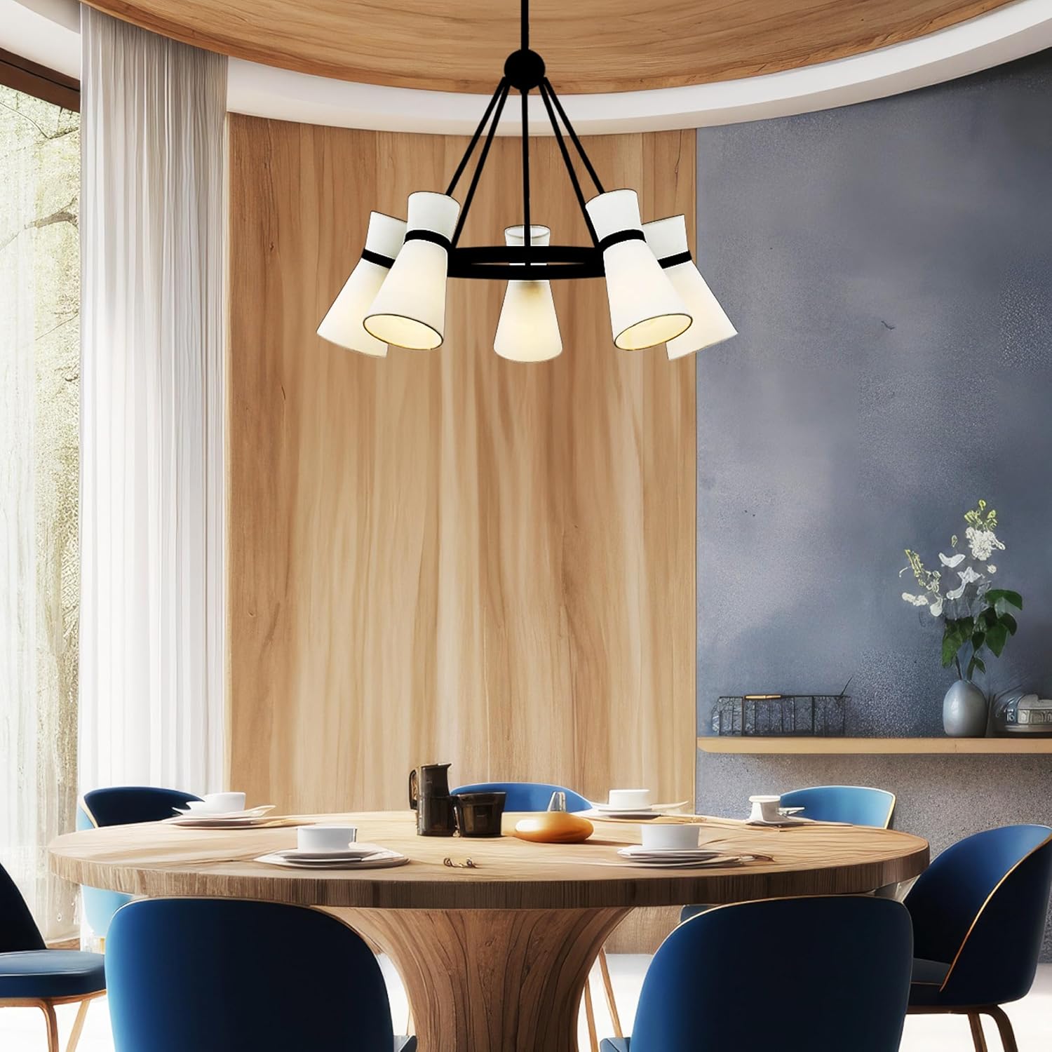 CLASSIC INDOOR LIGHTING FOR YOUR HOME DECOR Enjoy timeless elegance with our Generation Lighting 5-Light Clark Chandelier. This classy ceiling light fixture is an excellent addition to your home's interior. Enhance your room decor with this beautiful and simple modern lamp. It uses A19 standard or LED light bulbs to generate focused illumination inside your home. It's also a durable ceiling lamp light that withstands extreme humidity so you get modern ceiling lights that are meant to last. Every hanging lamp is crafted from solid steel and finished in a classic, rust resistant coat. This gives you corrosion-resistant fixtures that stay beautiful all year round. VERSATILE LIGHTING SOLUTION Our exquisite hanging lights create warm and inviting accents on your home's interior. They're designed to let you focus bright illumination only where it's needed so you can better enhance your home decor. They're ideal as kitchen light fixtures, pendant island lights for the dining room, or as living room pendant lights. The Clark Collection uses sleek, contemporary, damp-rated fixtures with white linen shades. SAFE, RELIABLE LAMPS: Your new ceiling light is cETL damp rated for safety, so you can enjoy peace of mind even in inclement weather. It's also Title 24 compliant for your home improvement needs if used with Joint Appendix (JA8) approved light bulbs listed in the California Energy Commission Appliance database. Get your Generation Lighting 5-Light Clark Chandelier today and build a stylish and charming atmosphere around your home.
