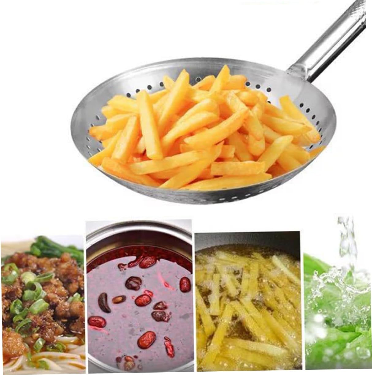 Package Include 1 x Colander Features - Color: Silver colander. - Material: Stainless steel hot pot colander. - Size: 54.00X28.00X8.00cm/21.22X11.00X3.14in frying oil strainer - The heat-resistant and ergonomically designed handle is easy to hold stainless steel spoons. - The firm handle makes cooking more comfortable food serving spoon. - your favorite French fries, vegetables, meat, wontons, etc french fries colander. - When picking up food, it is easy to let the liquid out. Quickly separate hot oil or boiling water mesh colander. - Easily clean stainless steel cookware with soapy water, or put it in the dishwasher conveniently to save time and energy colander spoon.Goods Informationcolander It is healthy for your life and suitable for all types of food and cooking.hot pot colander Unlike many other utensils that are flimsy, melt or break after a few uses, this kitchen utensil is crafted with stainless steel, and