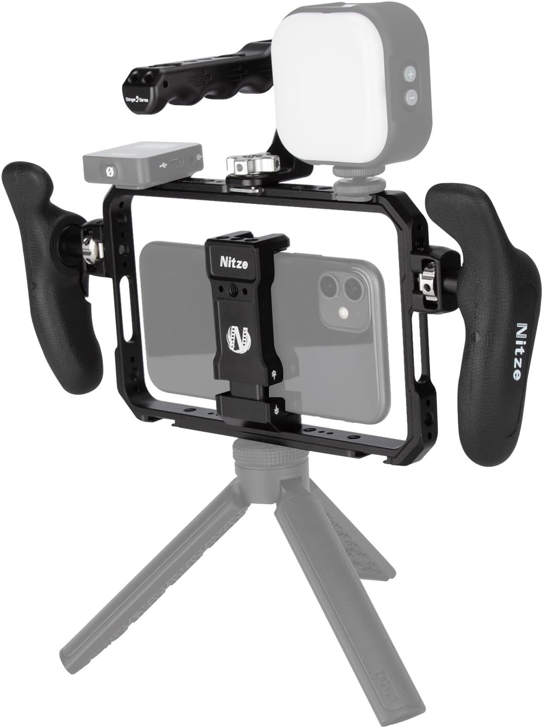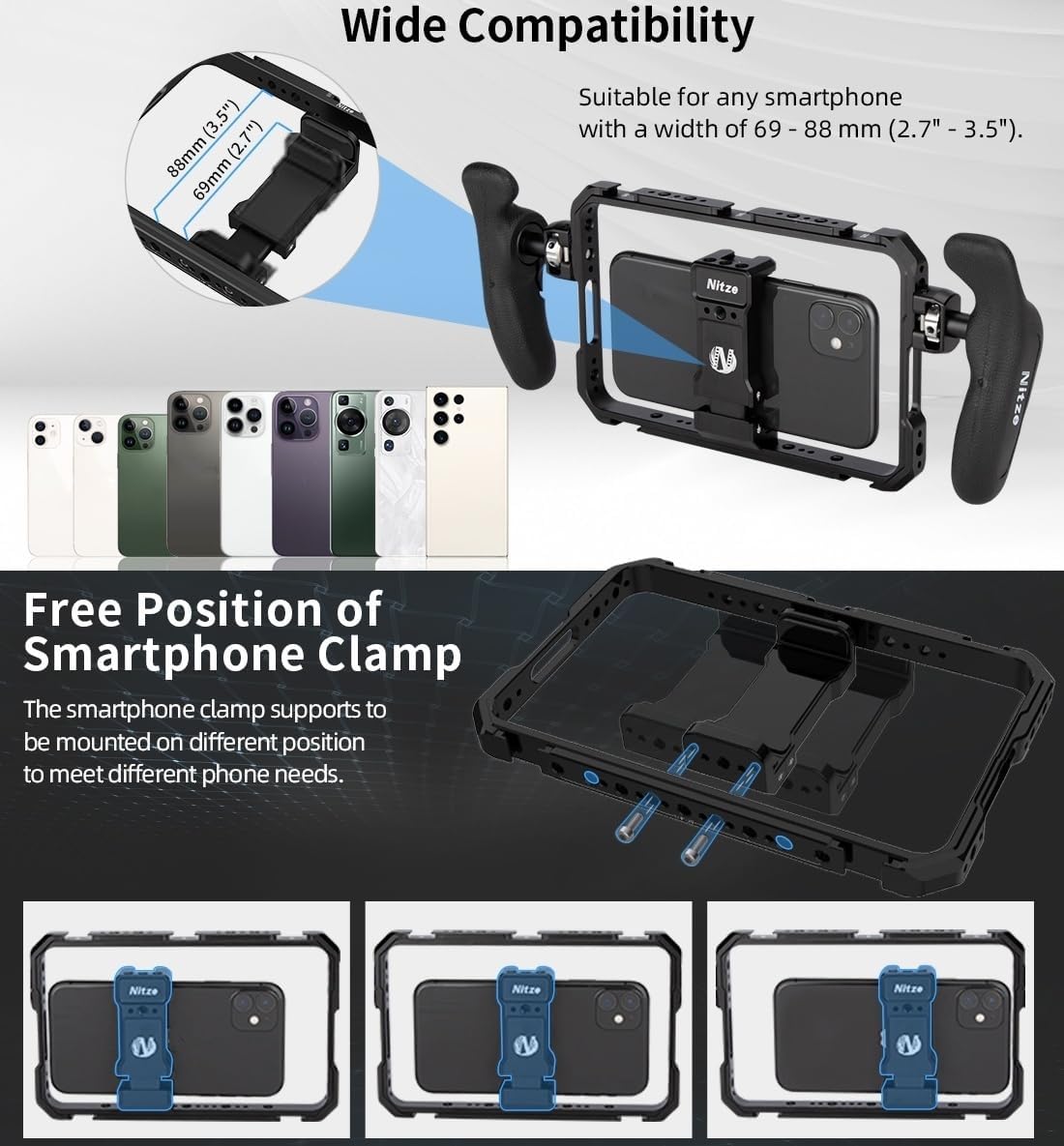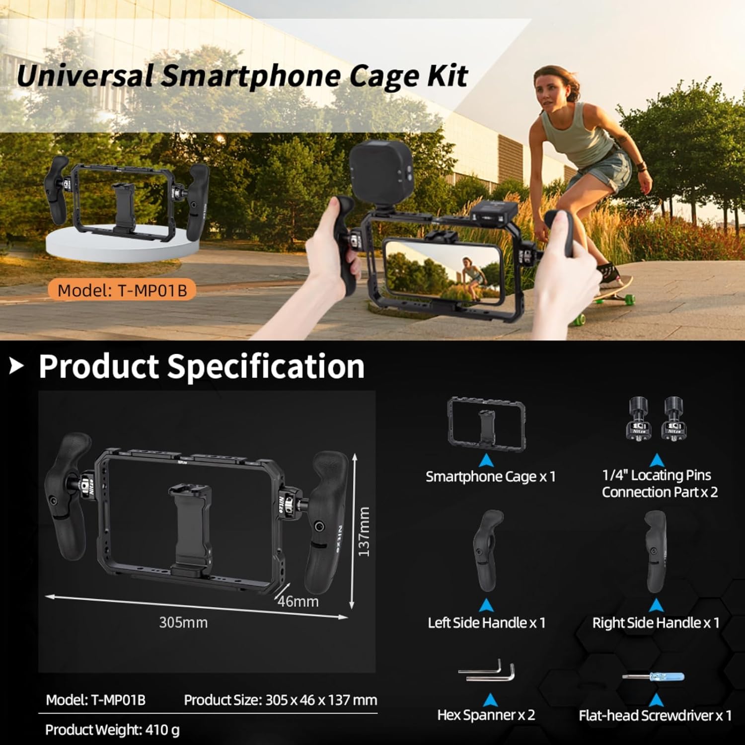 Model:T-MP01B Material: Aluminum Alloy Product Weight: 421 g Product Size: 305 x 46 x 137 mm Package Weight: 590 g Package Size: 243 x 158 x 53 mm Compatibility: Smartphone with a Width of 69 - 88 mm 1 x T-MP01A Smartphone Cage 1 x PA32D Side Handle Kit 2 x Hex Spanner 1 x Flat-head Screwdriver