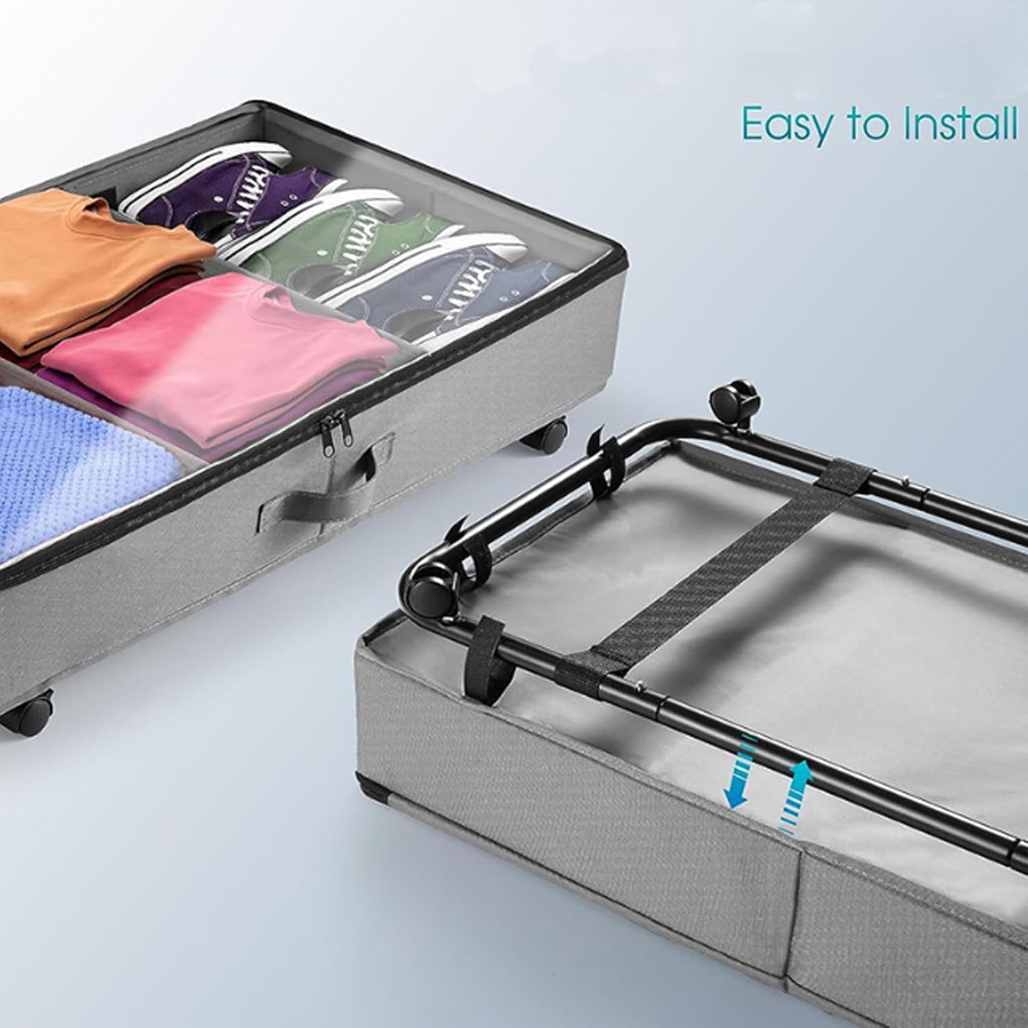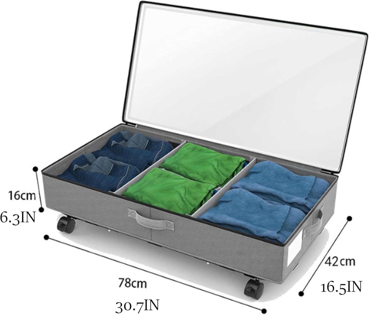 Features:Transparent Lid Makes It Easier To Access/Store Items, And The Transparent Card Storage Slot On The Side Helps To Sort Out The Contents Without Opening The Lid. The Accompanying Package Is Equipped With A Wrench To Strengthen The Wheel And Assembly Instructions, Which Can Be Assembled More Quickly After Receiving The Goods.Specification:Name: Under Bed Storage Box On WheelsScope Of Application: Shoes, Underwear, Socks, Sweaters, Bras, Toys, Quilts, ClothingMaterial: Oxford ClothWhether To Fold: YesPulley: YesCan It Be Carried By Hand: YesCapacity: 45LServieWe Attach Great Importance To The Satisfaction Of Our Customers. If You Have Any Questions Or Problems, Please Contact Us Directly. We Are Happy To Help You And Solve The Problem For You As Soon As Possible.