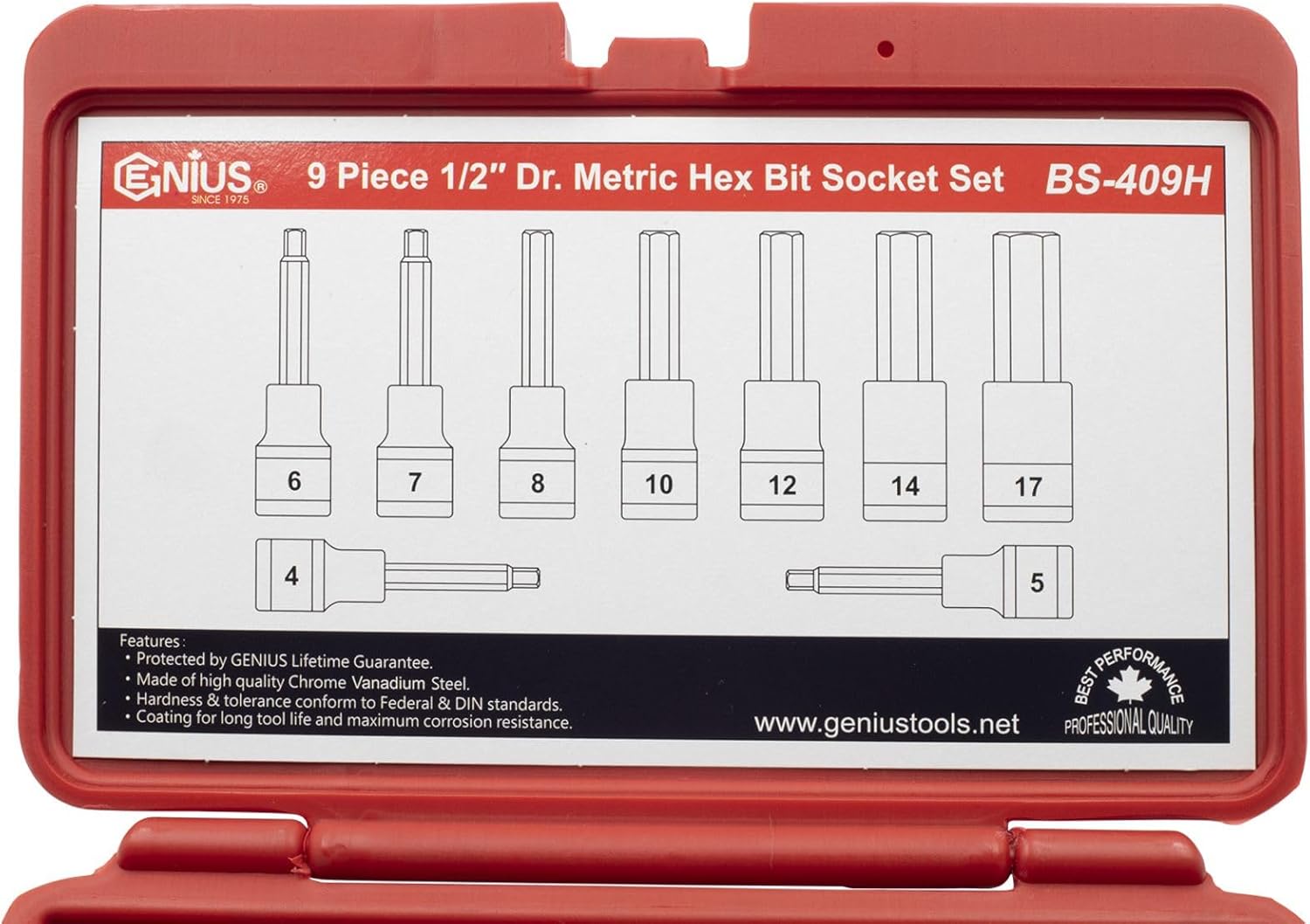 | Included Components | Genius Tools 9pc 1/2" Dr. Metric Hex Bit Socket Set BS-409H |