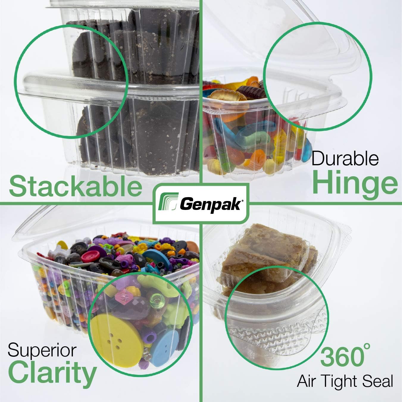 From the deli counter to the bakery table and everything in between, Genpak’s clear hinged deli containers have been used for every food application imaginable. Not only are our deli containers great for food products, their durability, stacking feature, and one-piece hinged construction make them terrific for industrial uses as well, such as nails, nuts, and bolts, or even fishing tackle. We offer our clear hinged deli containers in an array of sizes ranging from 4 oz to 64 oz, excellent for a variety of uses given their unique design. Their patented 360-degree seal allows for leak-resistant closure and exceptional water vapor barrier providing an extended shelf life. Our hinged deli containers offer a one-stop-shop for displaying your products ranging from spices and dips to sandwiches and bakery delights. Our deli containers will elevate your products with the unmatched clarity allowing for a 360-degree view. In addition to your customer’s love for the visibility of your products in Genpak’s containers, mother nature will be pleased with your choice of container. At Genpak, we manufacture our deli containers using a minimum of 30% post-consumer recycled plastic, making they #1 curbside recyclable. Annually, we save more than 10 million pounds of PCR resin, which is equivalent to diverting more than 350 million clear plastic water bottles from landfills.