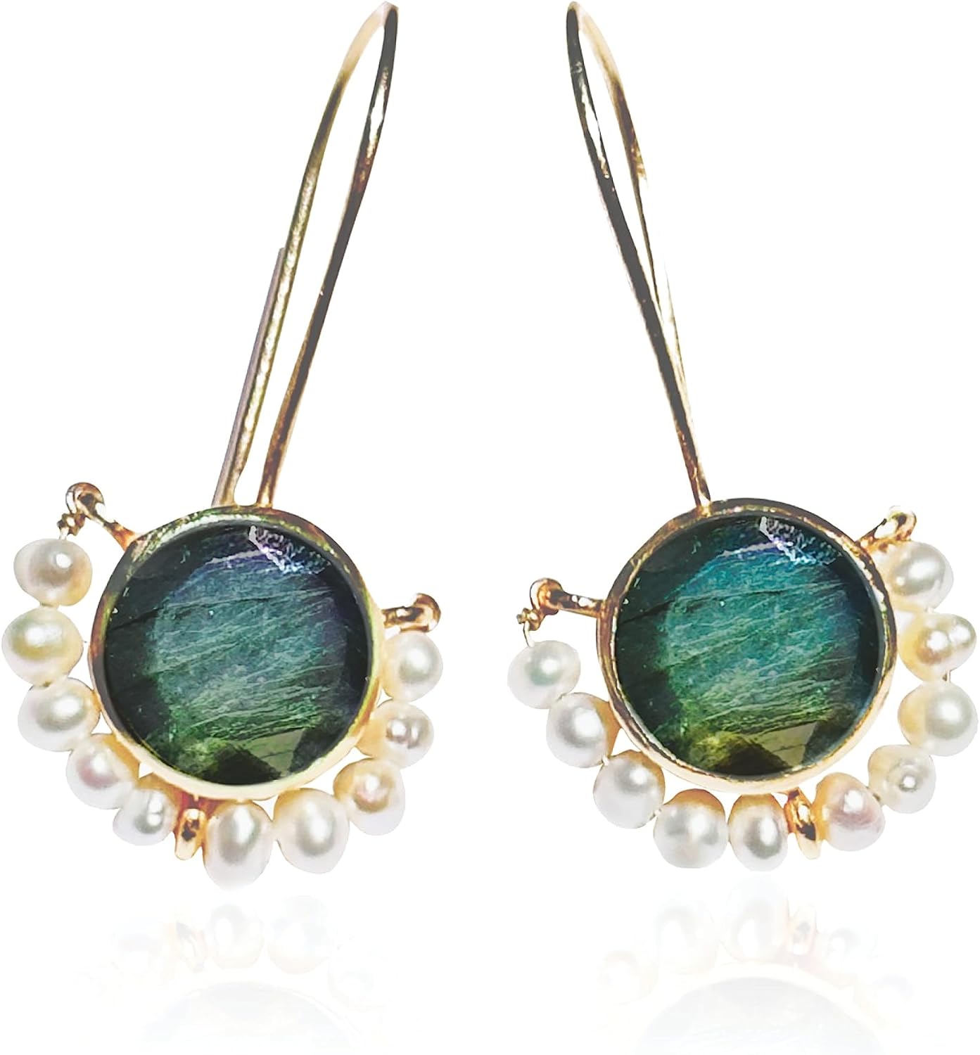 These enchanting earrings showcase the captivating allure of organic labradorite. With its mesmerizing iridescence, labradorite captures the light in a dance of vibrant colors, evoking the mystery of the universe. Each facet reflects the infinite possibilities life offers, inviting you to embrace your own journey of self-discovery.Complementing the labradorite are irregular pearls, which impart a timeless elegance to the design. Each pearl is unique, symbolizing beauty and grace while offering a touch of sophistication. The combination of labradorite and pearls creates a harmonious balance that enhances your innate charm.Why Choose Joyfulmuze Jewelry? By choosing Joyfulmuze, you support a local artist while acquiring original, high-quality handmade jewelry. Our materials are ethically sourced from Fair Trade suppliers, allowing you to cherish both the beauty and craftsmanship of each piece.